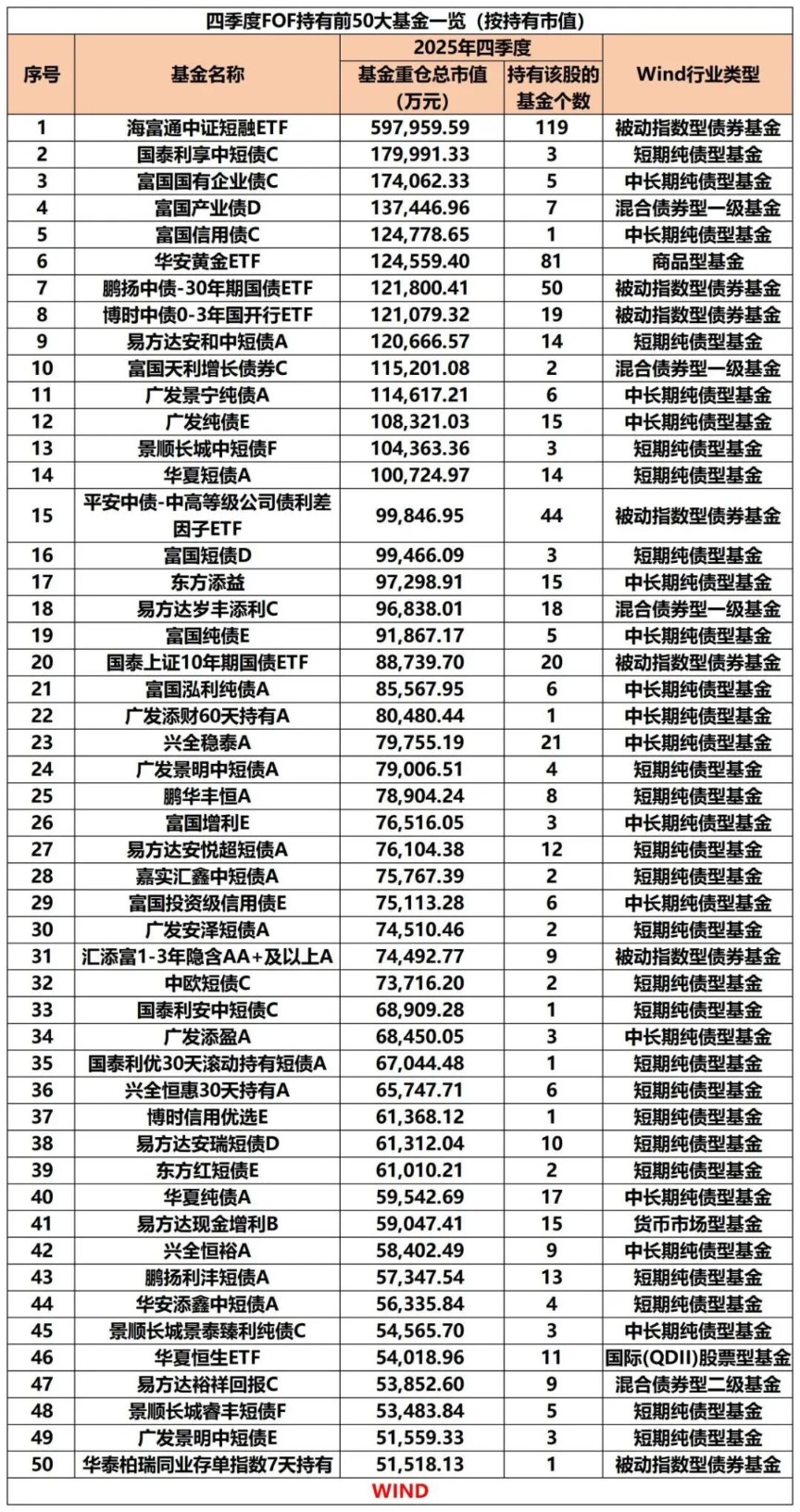 Wind数据显示,公募FOF2025年四季度末重仓的前50大基金中,债券型基金仍是FOF重仓“主力军”,数量达40只。同时,伴随指数投资时代的加速到来,被动指数型产品也成为FOF重仓基金。