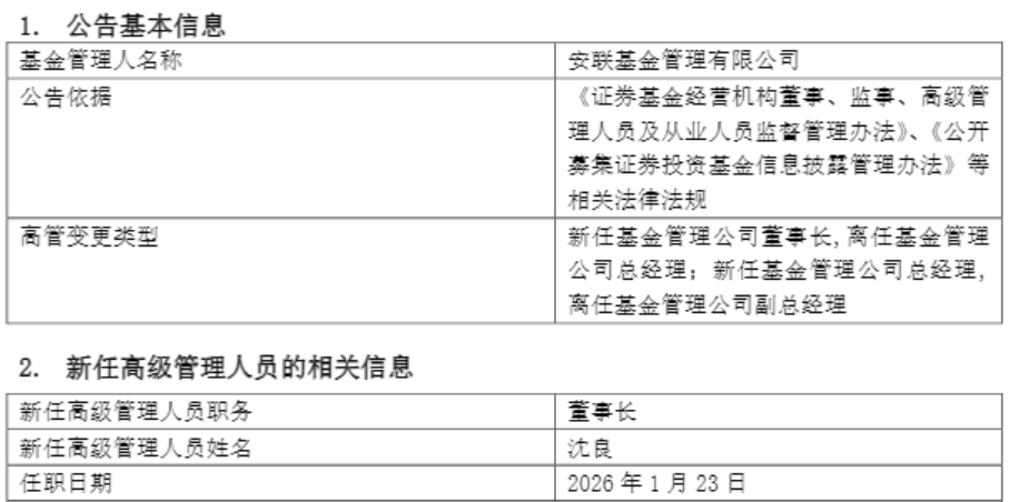 1月23日晚间,安联基金发布公告称,任命沈良为公司董事长,郑宇尘接任总经理一职。