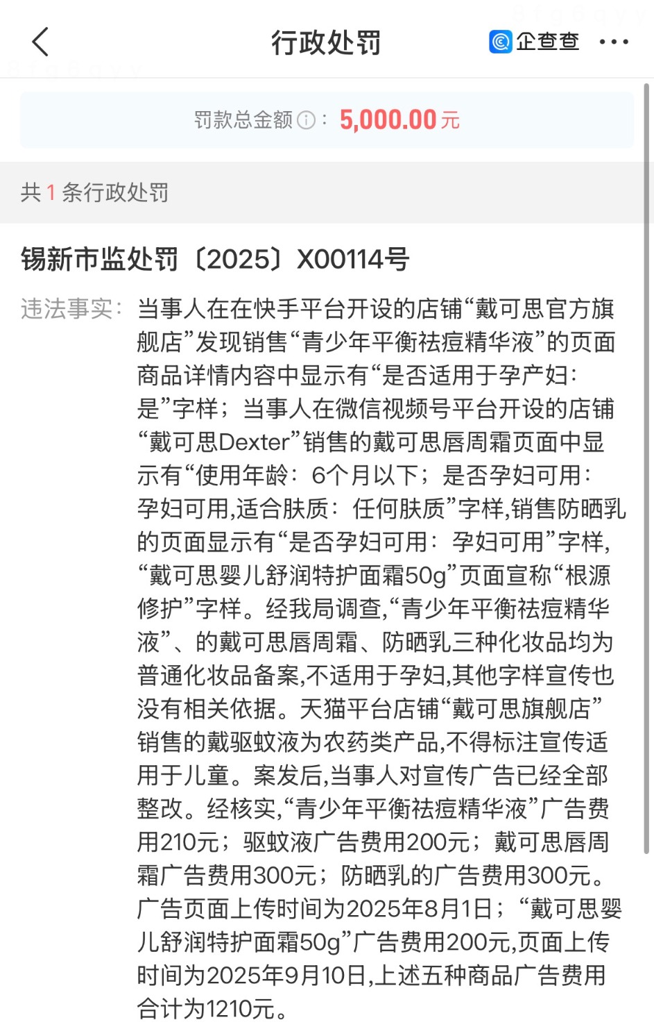 2025年12月,戴可思因构成虚假广告被无锡高新技术产业开发区(无锡市新吴区)市场监督管理局罚款5000元。彼时,经监管部门调查,品牌销售的青少年平衡祛痘精华液、戴可思唇周霜、防晒乳三种化妆品均为普通化妆品备案,不适用于孕妇。但商品详情内容中却标注为孕妇可用。此外,“戴可思婴儿舒润特护面霜50g”页面宣称“根源修护”,没有相关依据。
