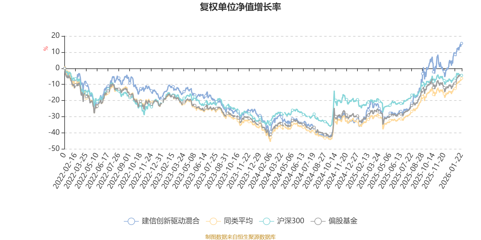 截至1月22日,建信创新驱动混合近三个月复权单位净值增长率为14.54%,位于同类可比基金32/185;近半年复权单位净值增长率为47.26%,位于同类可比基金21/185;近一年复权单位净值增长率为65.62%,位于同类可比基金18/183;近三年复权单位净值增长率为31.03%,位于同类可比基金42/176。
