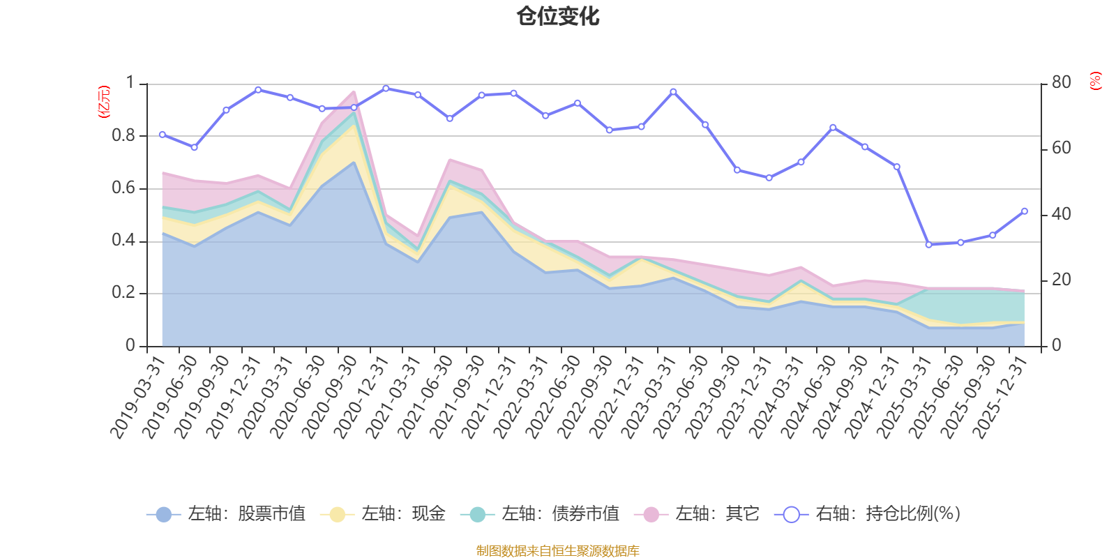 据定期报告数据统计,近三年平均股票仓位为52.17%,同类平均为72.57%。2020年末基金达到78.58%的最高仓位,2025年一季度末最低,为30.96%。