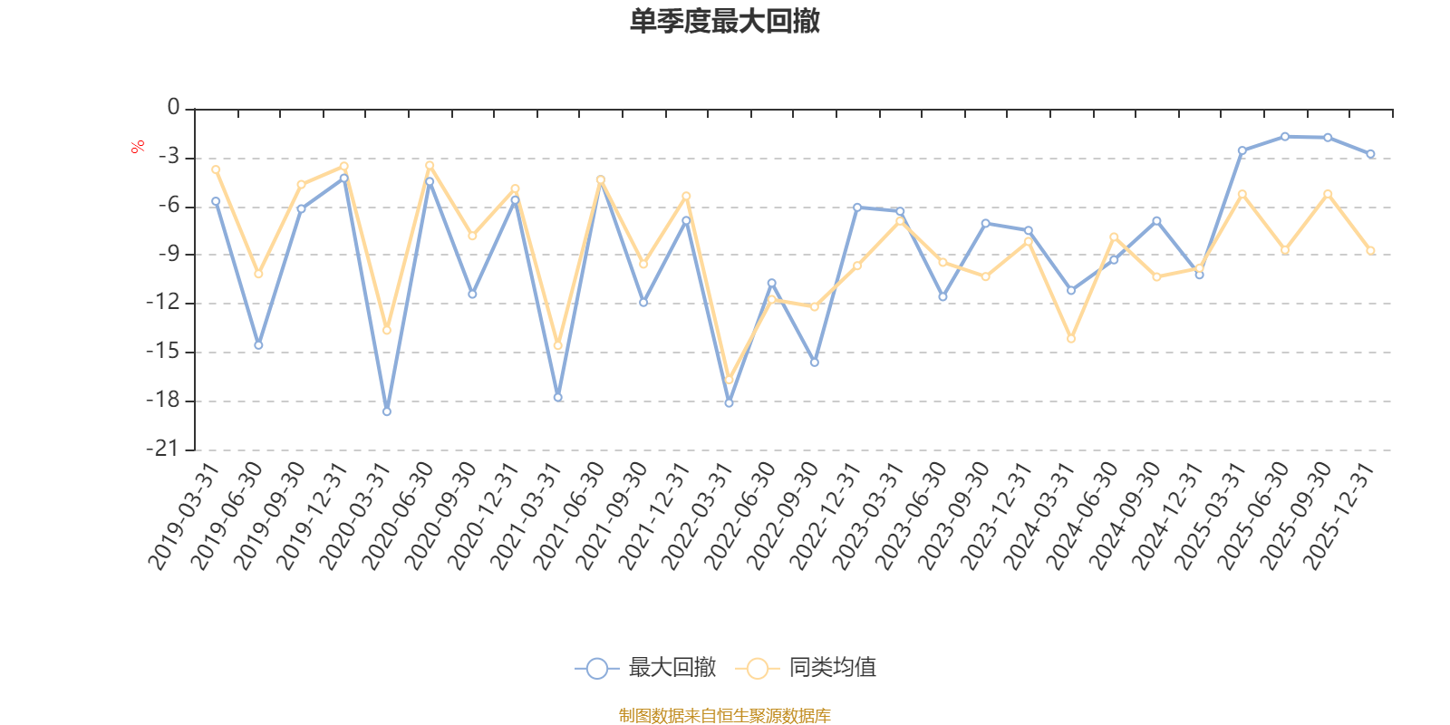 截至1月21日,基金近三年最大回撤为32.5%,同类可比基金排名629/1264。单季度最大回撤出现在2020年一季度,为18.64%。