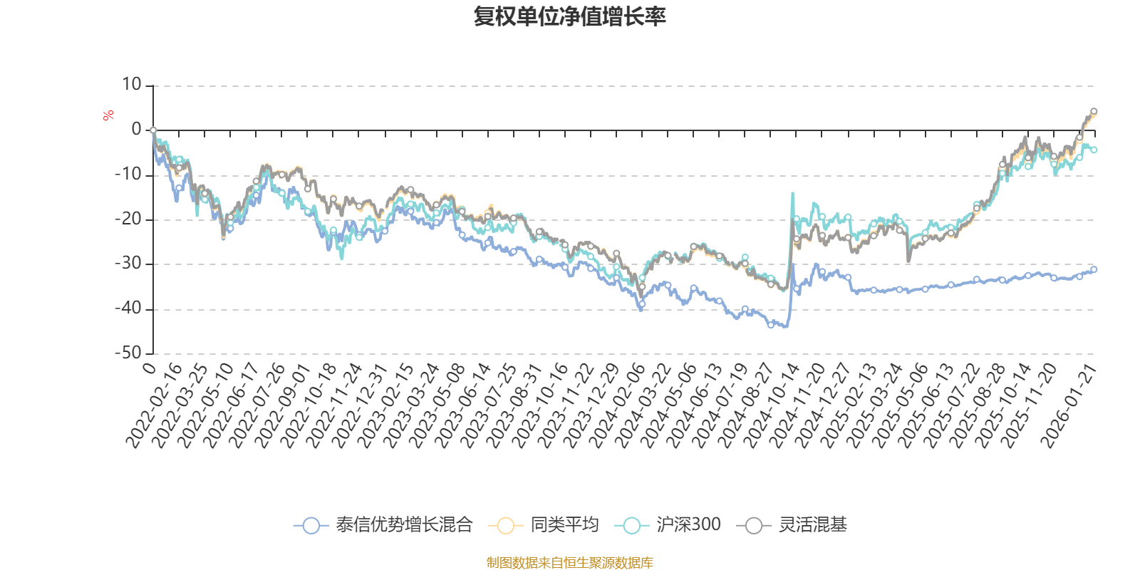 截至1月21日,泰信优势增长混合近三个月复权单位净值增长率为1.69%,位于同类可比基金1060/1286;近半年复权单位净值增长率为3.92%,位于同类可比基金1101/1286;近一年复权单位净值增长率为7.28%,位于同类可比基金1139/1286;近三年复权单位净值增长率为-16.86%,位于同类可比基金1204/1286。