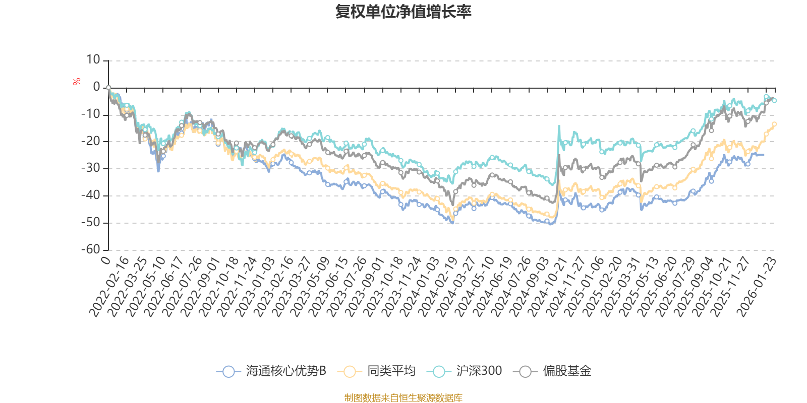 截至12月31日,海通核心优势B近三个月复权单位净值增长率为1.39%,位于同类可比基金602/689;近半年复权单位净值增长率为28.53%,位于同类可比基金288/689;近一年复权单位净值增长率为33.62%,位于同类可比基金409/674;近三年复权单位净值增长率为6.03%,位于同类可比基金257/396。