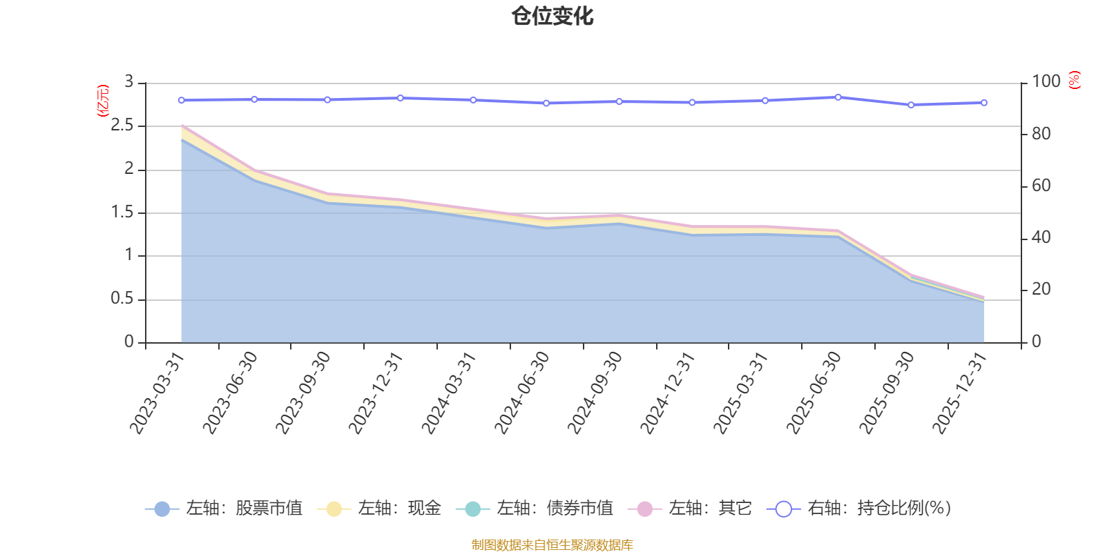 据定期报告数据统计,基金股票仓位长期保持较高水平,近三年平均股票仓位为93.07%,同类平均为85.83%。2025年上半年末基金达到94.46%的最高仓位,2025年三季度末最低,为91.47%。