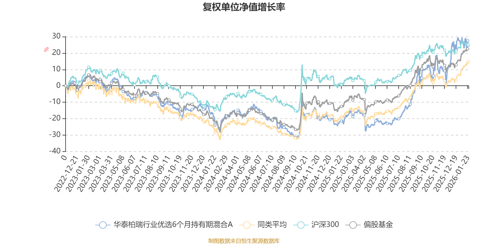 截至1月23日,华泰柏瑞行业优选6个月持有期混合A近三个月复权单位净值增长率为14.34%,位于同类可比基金168/621;近半年复权单位净值增长率为48.42%,位于同类可比基金67/621;近一年复权单位净值增长率为59.62%,位于同类可比基金139/613;近三年复权单位净值增长率为17.39%,位于同类可比基金264/535。