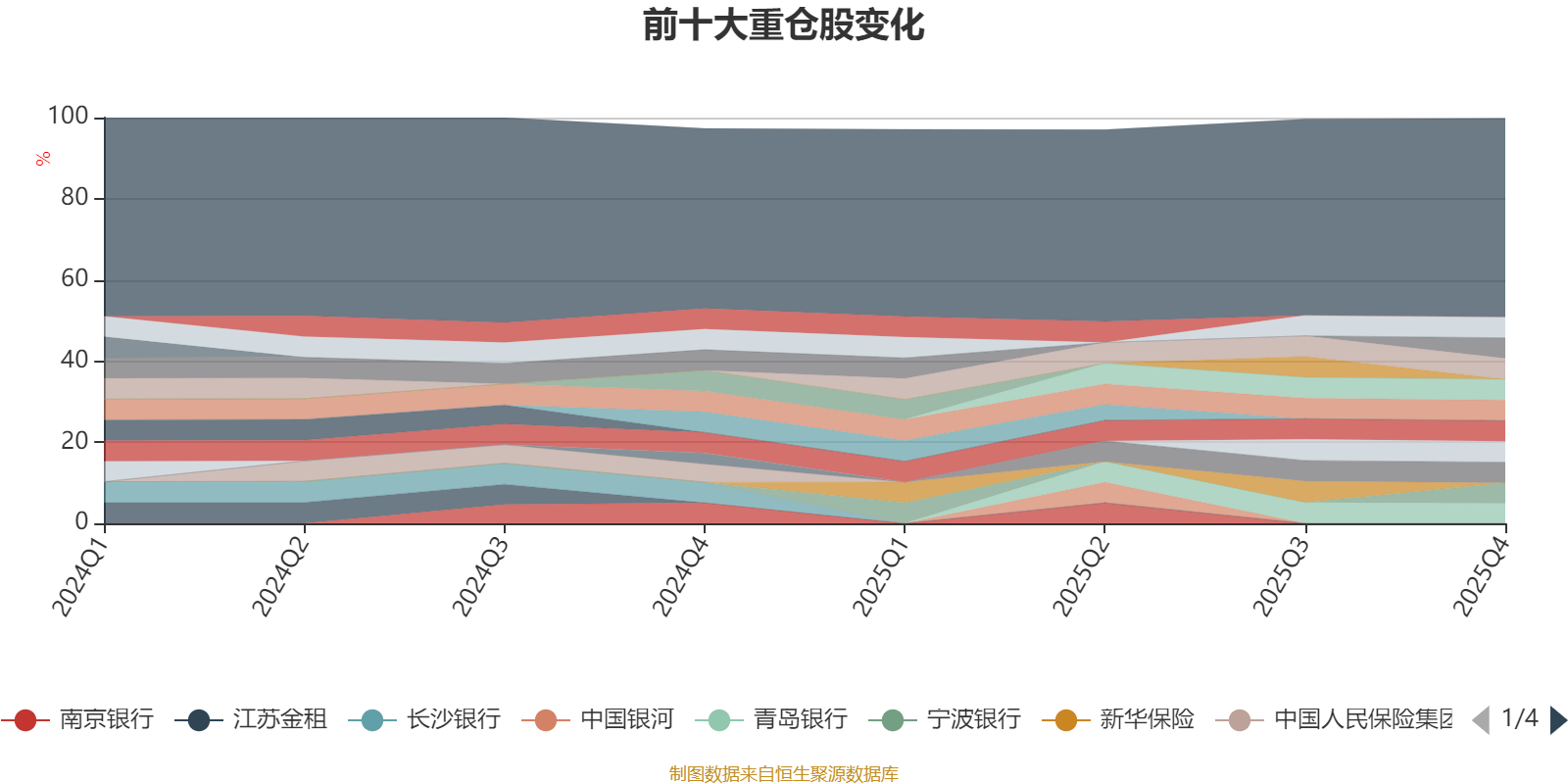 截至2025年四季度末,基金十大重仓股分别是滨江集团、江苏银行、常熟银行、齐鲁银行、渝农商行、成都银行、苏州银行、宁波银行、杭州银行、青岛银行。