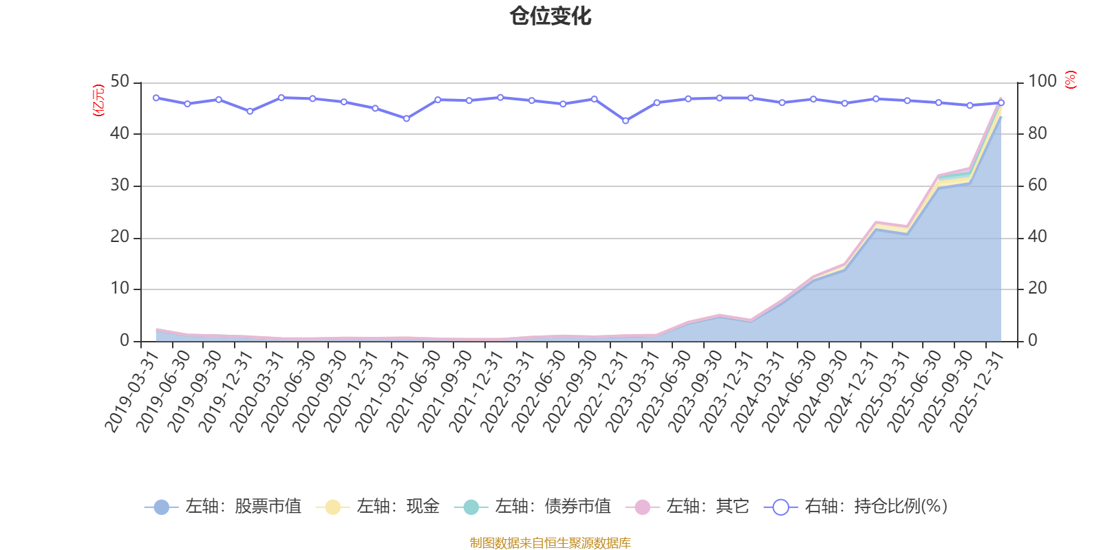 据定期报告数据统计,近三年平均股票仓位为92.84%,同类平均为72.57%。2021年末基金达到94.23%的最高仓位,2022年末最低,为85.24%。