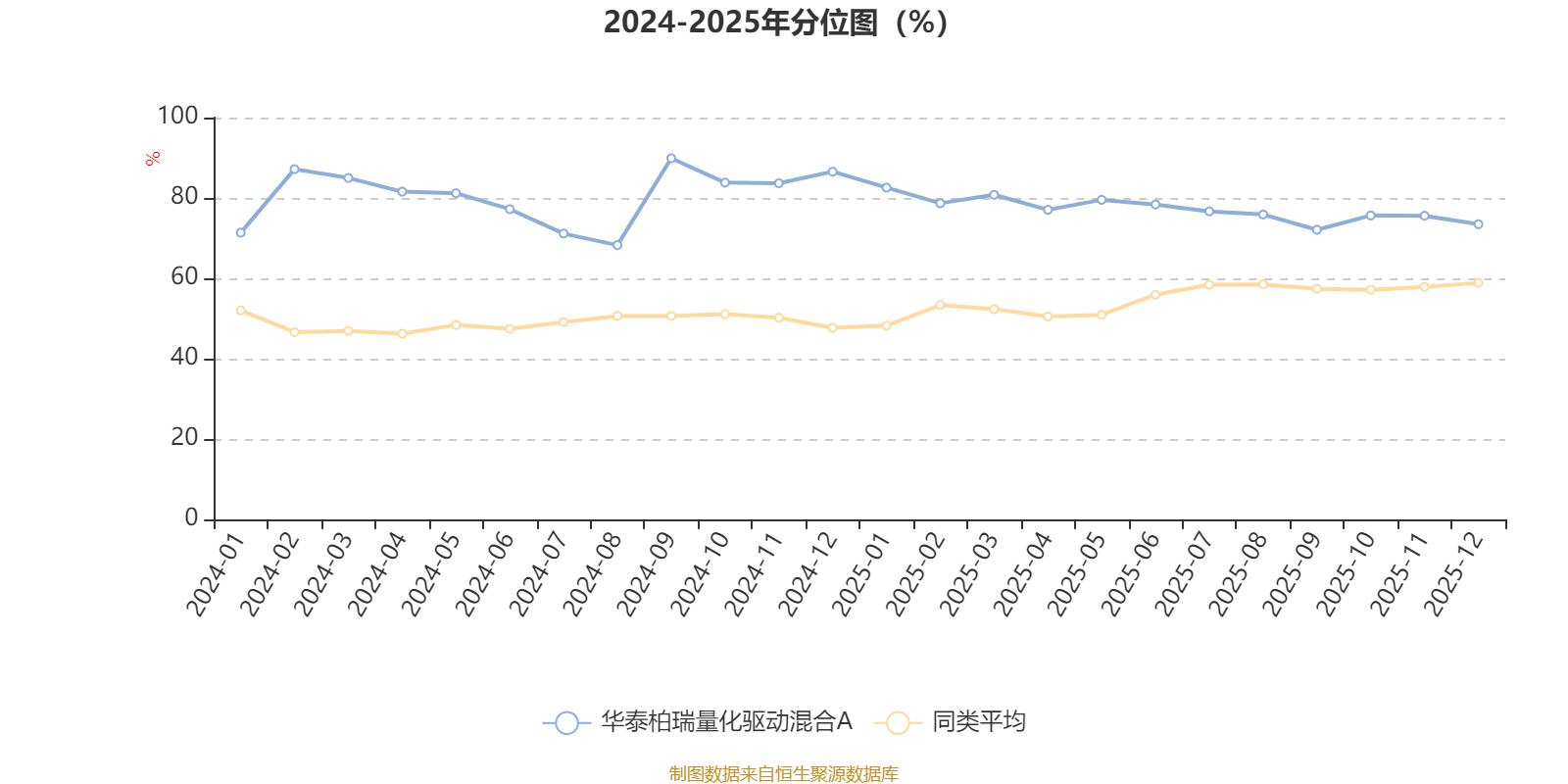 通过所选区间该基金净值增长率分位图,可以观察该基金与同类基金业绩比较情况。图为坐标原点到区间内某时点的净值增长率在同类基金中的分位数。