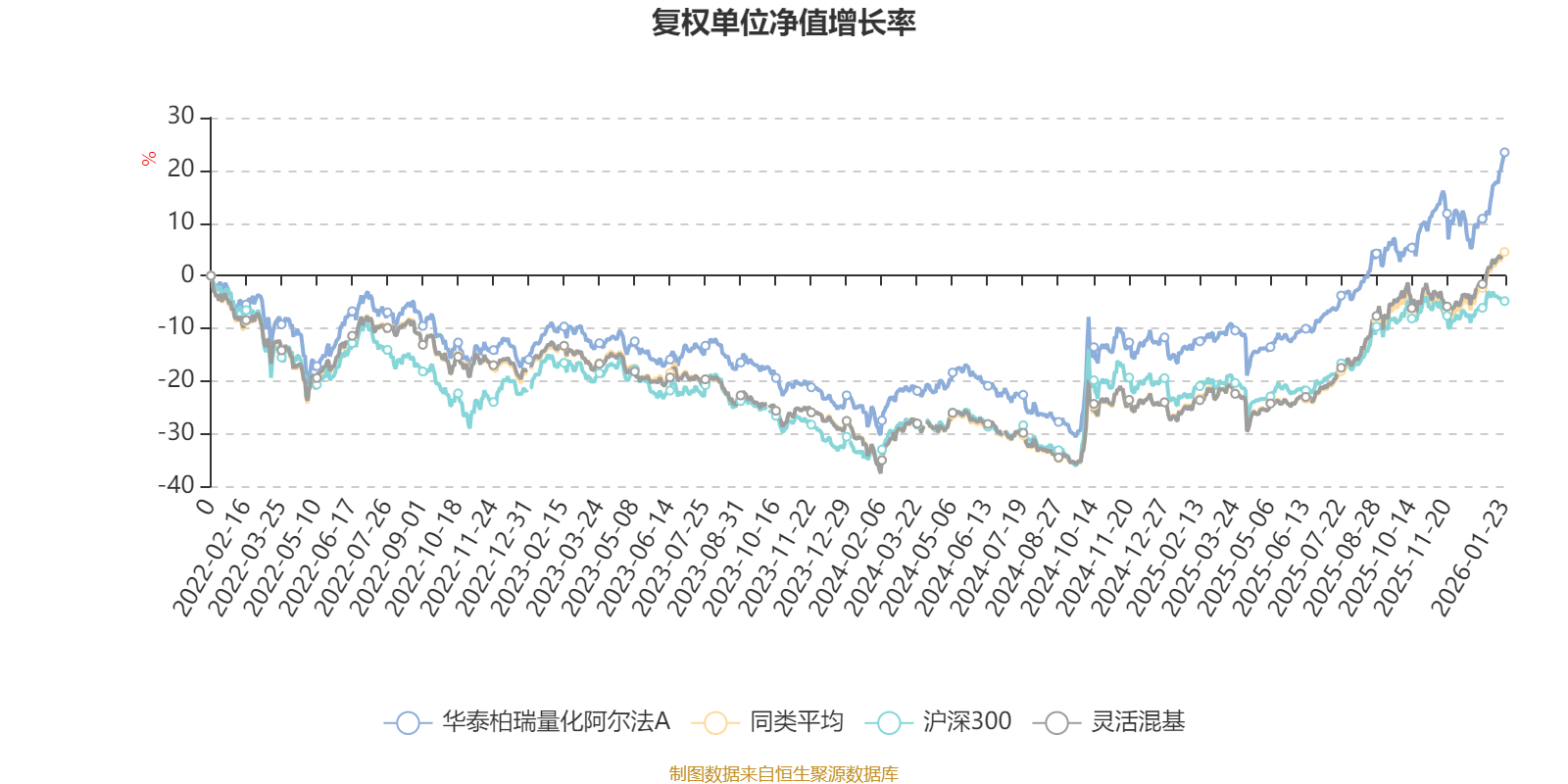 截至1月23日,华泰柏瑞量化阿尔法A近三个月复权单位净值增长率为12.97%,位于同类可比基金468/1286;近半年复权单位净值增长率为28.21%,位于同类可比基金505/1286;近一年复权单位净值增长率为43.33%,位于同类可比基金482/1286;近三年复权单位净值增长率为36.97%,位于同类可比基金310/1286。