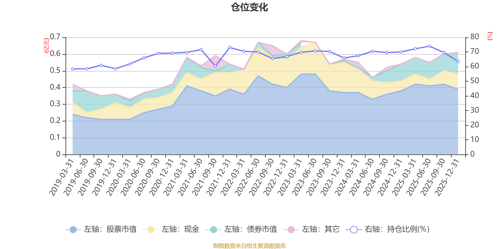 据定期报告数据统计,近三年平均股票仓位为69.48%,同类平均为72.57%。2025年上半年末基金达到73.97%的最高仓位,2019年一季度末最低,为58.43%。
