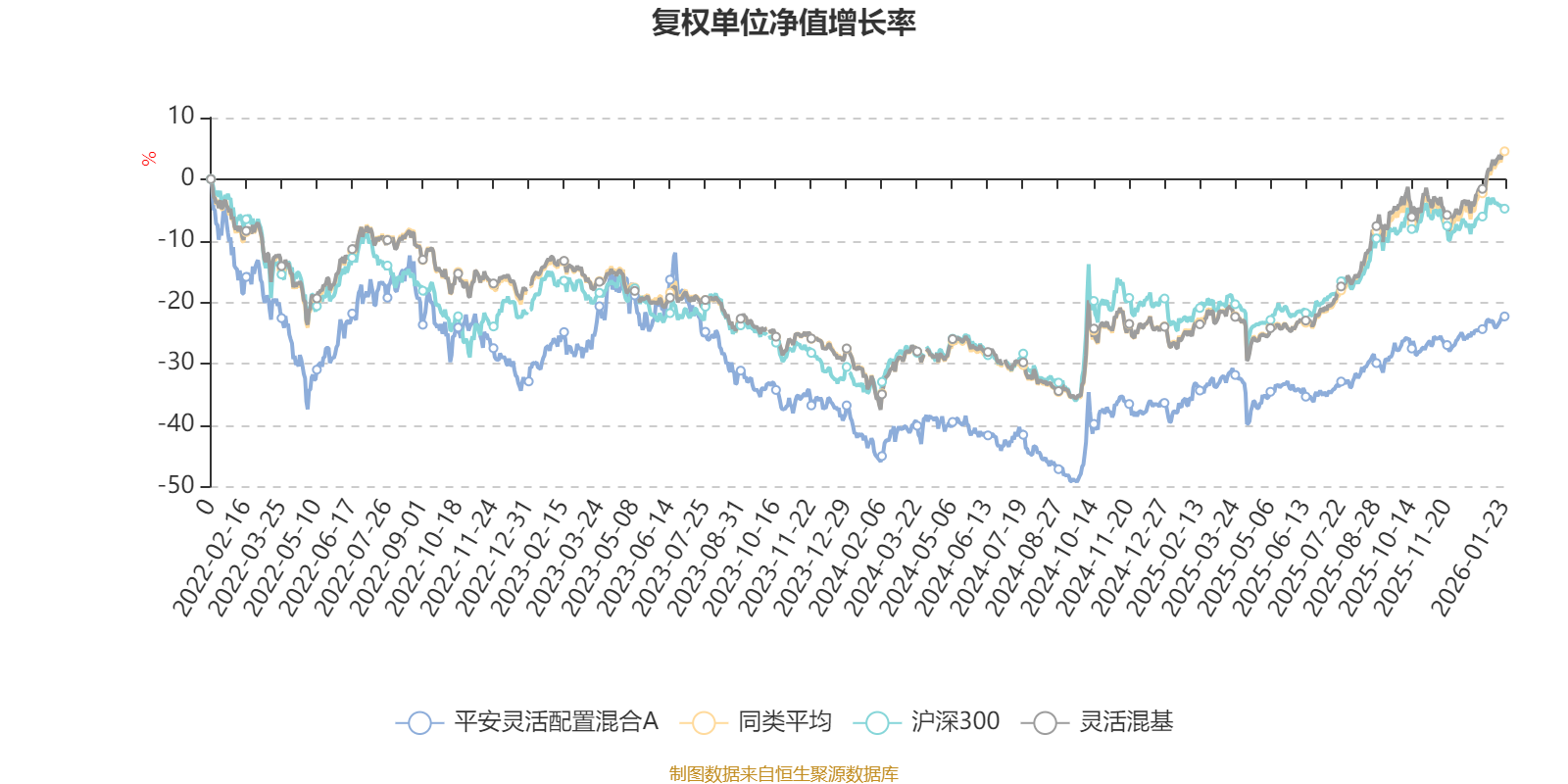 截至1月23日,平安灵活配置混合A近三个月复权单位净值增长率为7.67%,位于同类可比基金744/1286;近半年复权单位净值增长率为15.82%,位于同类可比基金811/1286;近一年复权单位净值增长率为23.05%,位于同类可比基金881/1286;近三年复权单位净值增长率为6.76%,位于同类可比基金895/1286。
