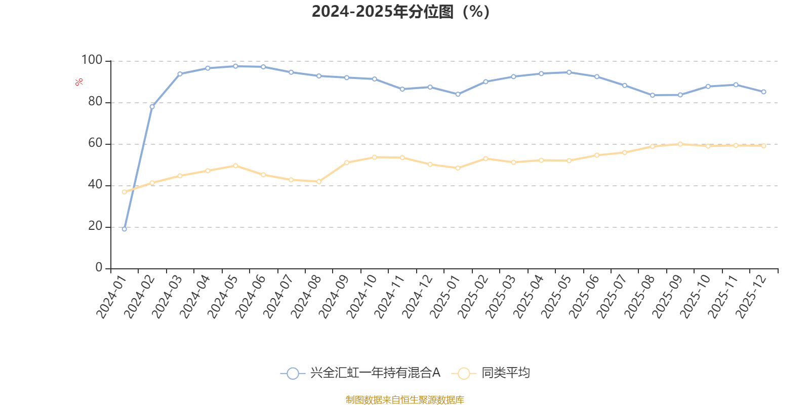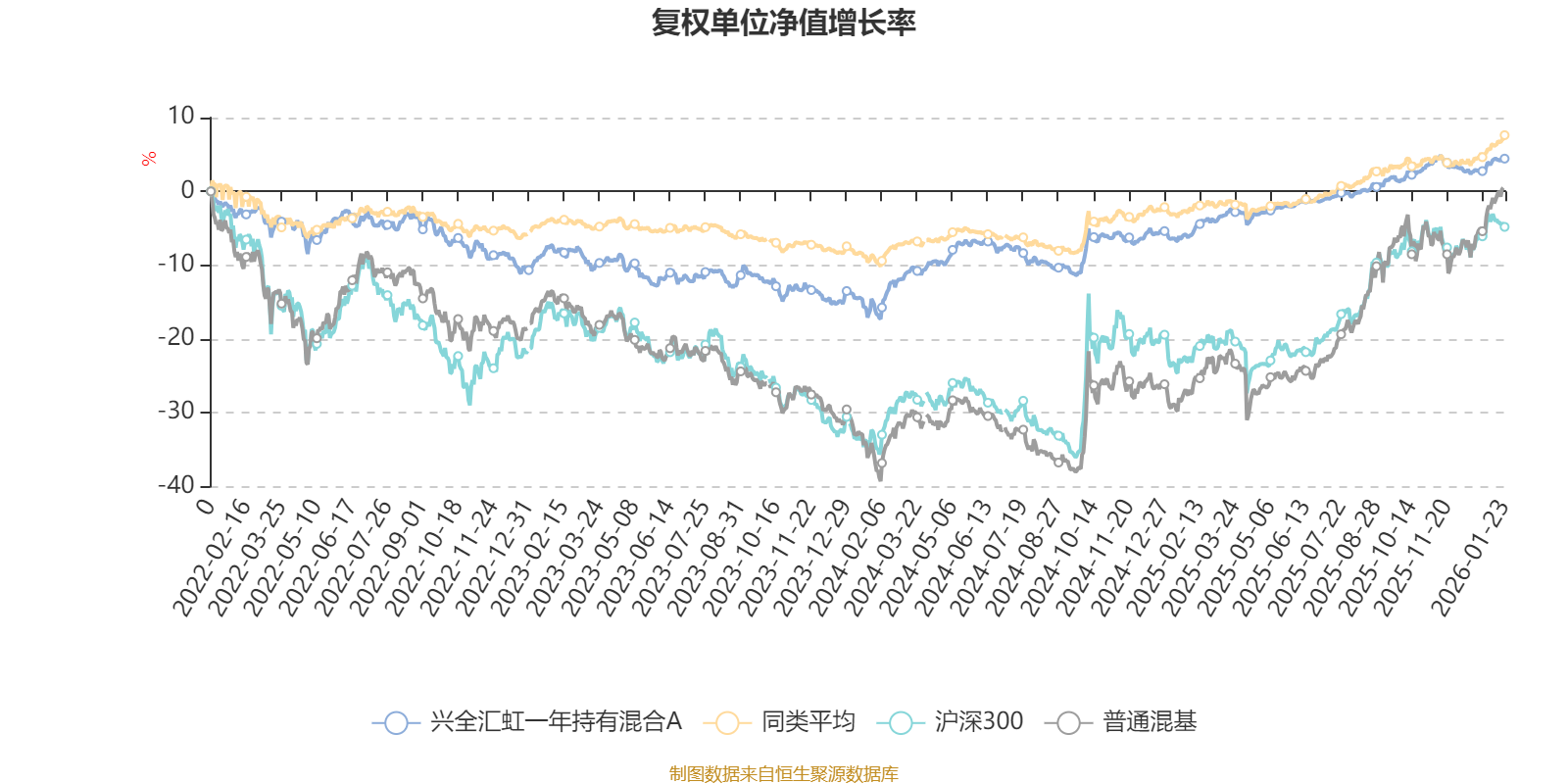 截至1月23日,兴全汇虹一年持有混合A近三个月复权单位净值增长率为1.56%,位于同类可比基金420/629;近半年复权单位净值增长率为4.58%,位于同类可比基金306/629;近一年复权单位净值增长率为11.42%,位于同类可比基金172/626;近三年复权单位净值增长率为12.81%,位于同类可比基金252/564。