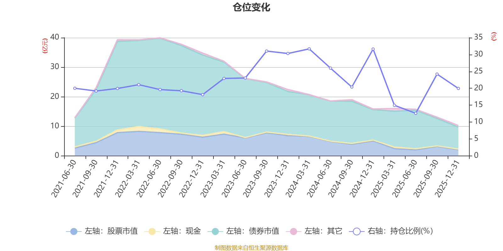 据定期报告数据统计,近三年平均股票仓位为24.05%,同类平均为19.2%。2024年一季度末基金达到31.68%的最高仓位,2025年上半年末最低,为12.59%。