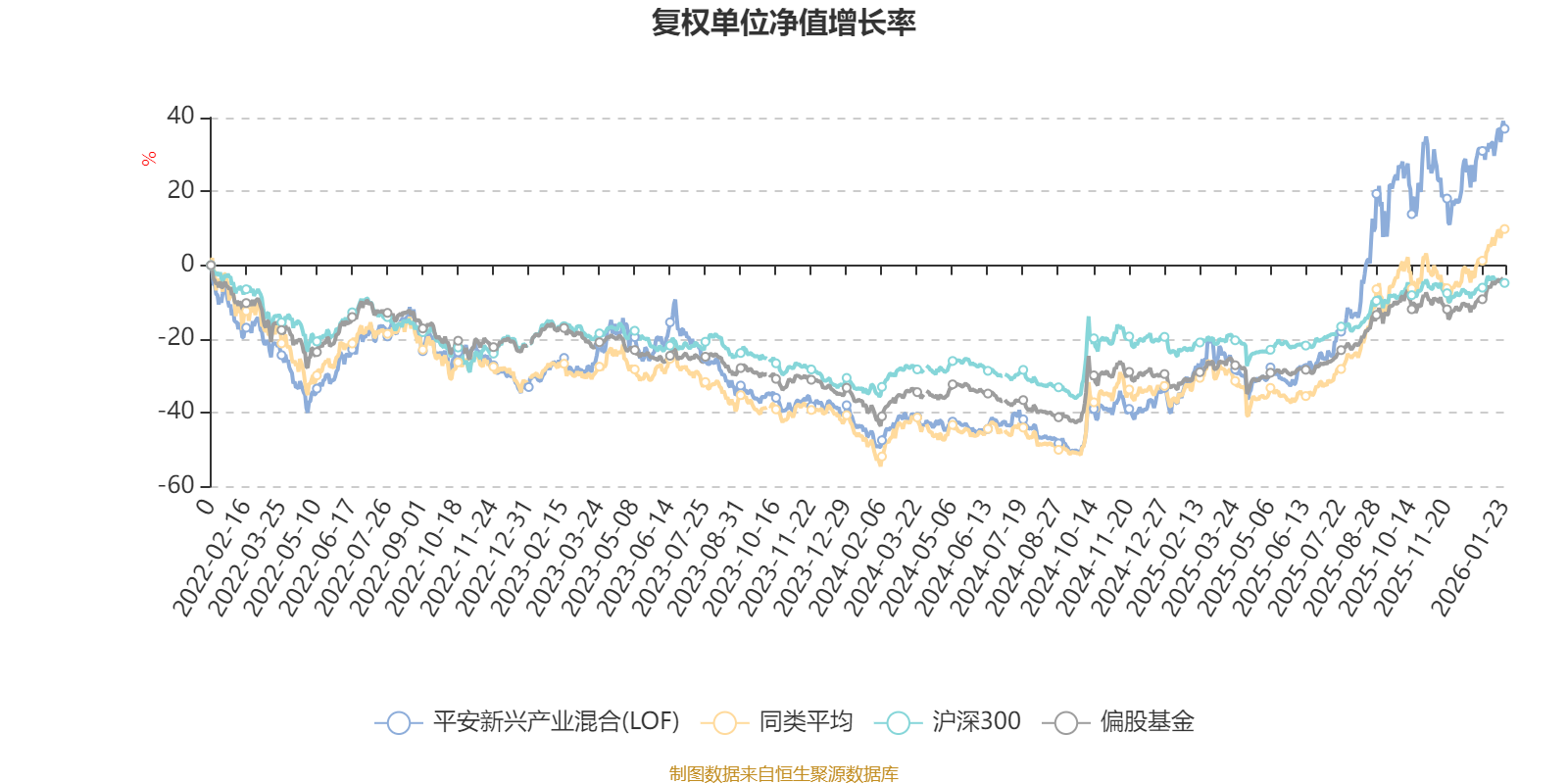 截至1月23日,平安新兴产业混合(LOF)近三个月复权单位净值增长率为14.28%,位于同类可比基金125/229;近半年复权单位净值增长率为67.06%,位于同类可比基金56/229;近一年复权单位净值增长率为101.82%,位于同类可比基金22/222;近三年复权单位净值增长率为89.94%,位于同类可比基金30/165。