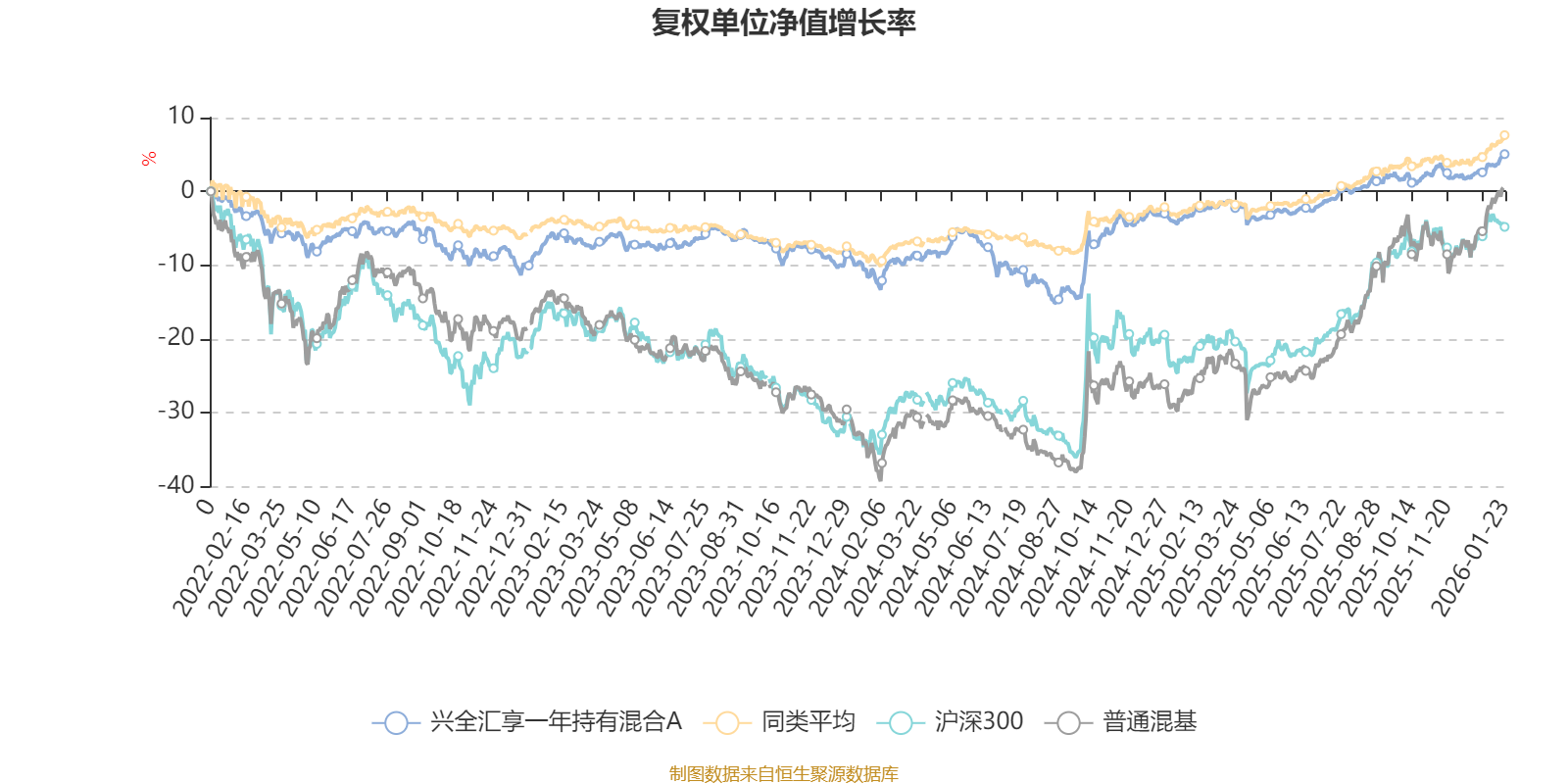截至1月23日,兴全汇享一年持有混合A近三个月复权单位净值增长率为3.23%,位于同类可比基金192/629;近半年复权单位净值增长率为4.64%,位于同类可比基金297/629;近一年复权单位净值增长率为8.86%,位于同类可比基金267/626;近三年复权单位净值增长率为12.32%,位于同类可比基金267/564。