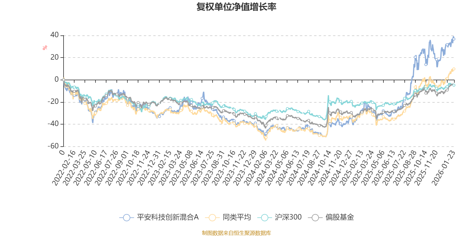 截至1月23日,平安科技创新混合A近三个月复权单位净值增长率为13.95%,位于同类可比基金132/229;近半年复权单位净值增长率为66.46%,位于同类可比基金57/229;近一年复权单位净值增长率为103.13%,位于同类可比基金19/222;近三年复权单位净值增长率为89.49%,位于同类可比基金32/165。