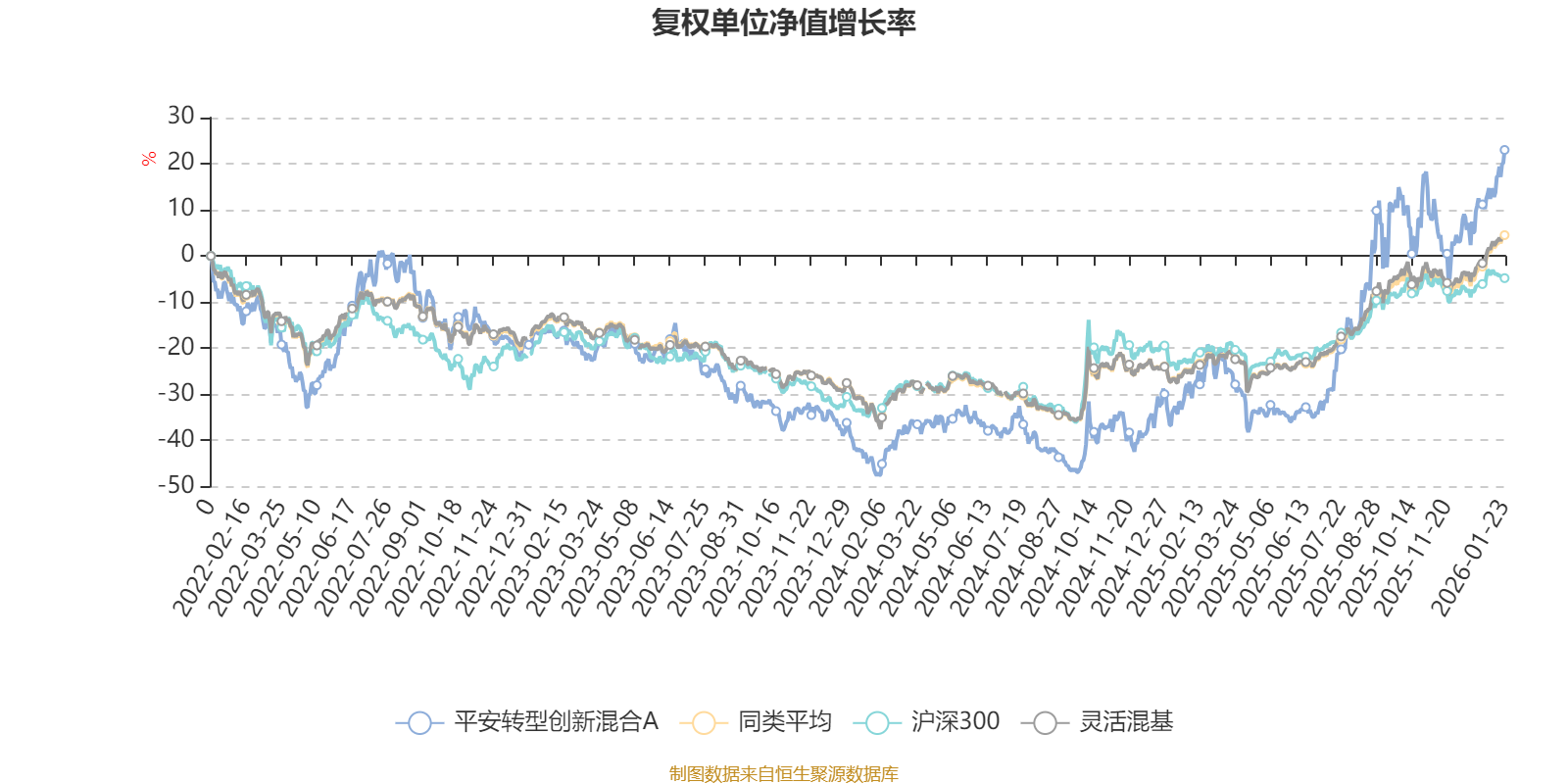 截至1月23日,平安转型创新混合A近三个月复权单位净值增长率为15.91%,位于同类可比基金328/1286;近半年复权单位净值增长率为55.30%,位于同类可比基金127/1286;近一年复权单位净值增长率为75.08%,位于同类可比基金111/1286;近三年复权单位净值增长率为47.04%,位于同类可比基金209/1286。