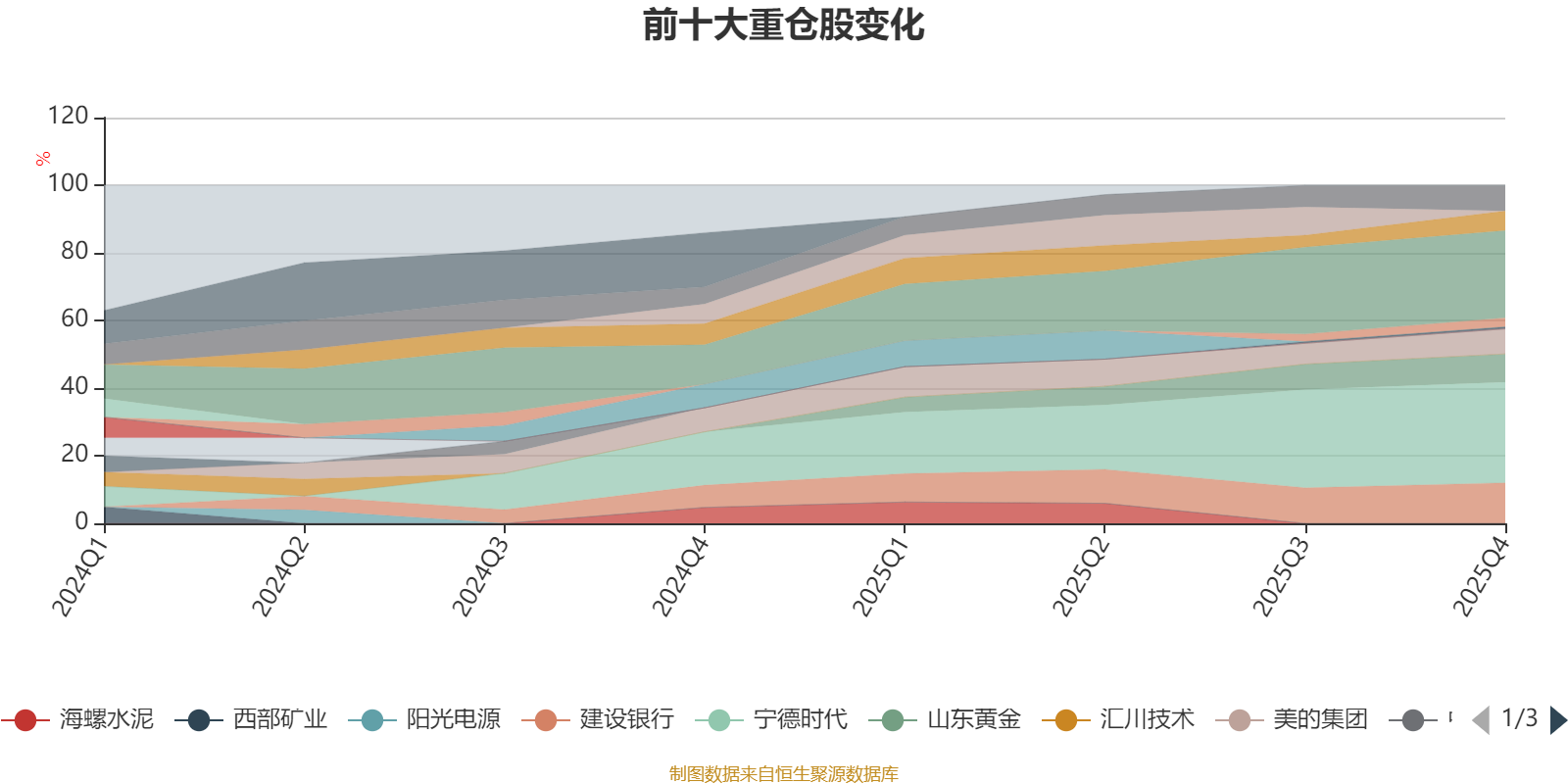 该基金持股集中度较高,近2年前十大重仓股集中度长期超过60%。截至2025年四季度末,基金重仓股分别是宁德时代、腾讯控股、建设银行、山东黄金、中国神华、美的集团、中国铝业、工商银行、美团-W。
