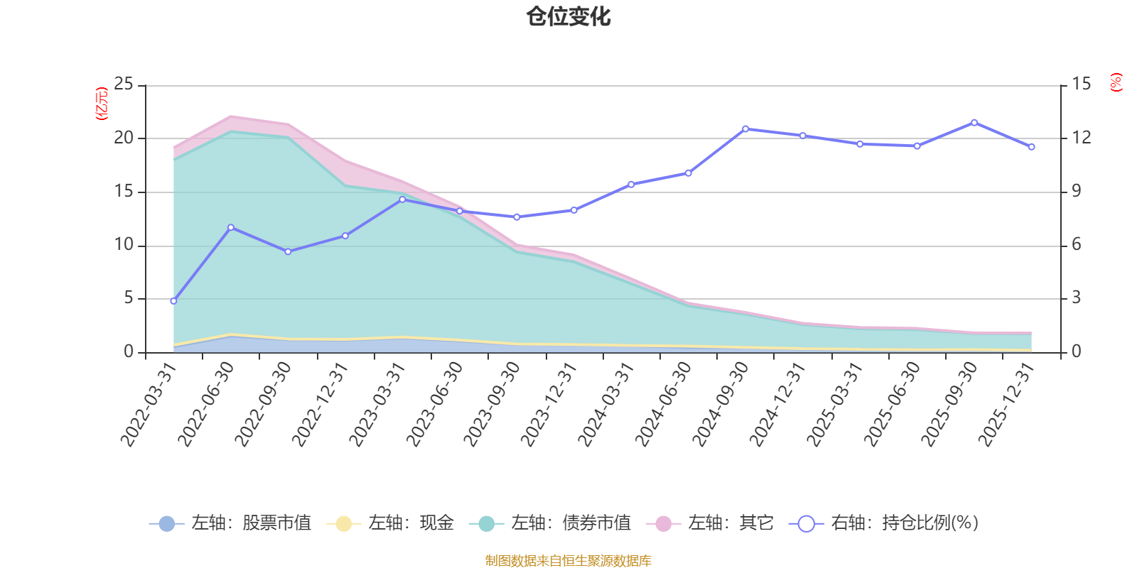 据定期报告数据统计,近三年平均股票仓位为10.34%,同类平均为19.2%。2025年三季度末基金达到12.9%的最高仓位,2022年一季度末最低,为2.89%。