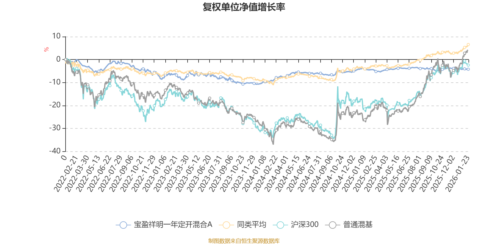截至1月23日,宝盈祥明一年定开混合A近三个月复权单位净值增长率为-0.03%,位于同类可比基金602/629;近半年复权单位净值增长率为-0.76%,位于同类可比基金623/629;近一年复权单位净值增长率为0.33%,位于同类可比基金620/626;近三年复权单位净值增长率为2.00%,位于同类可比基金516/564。