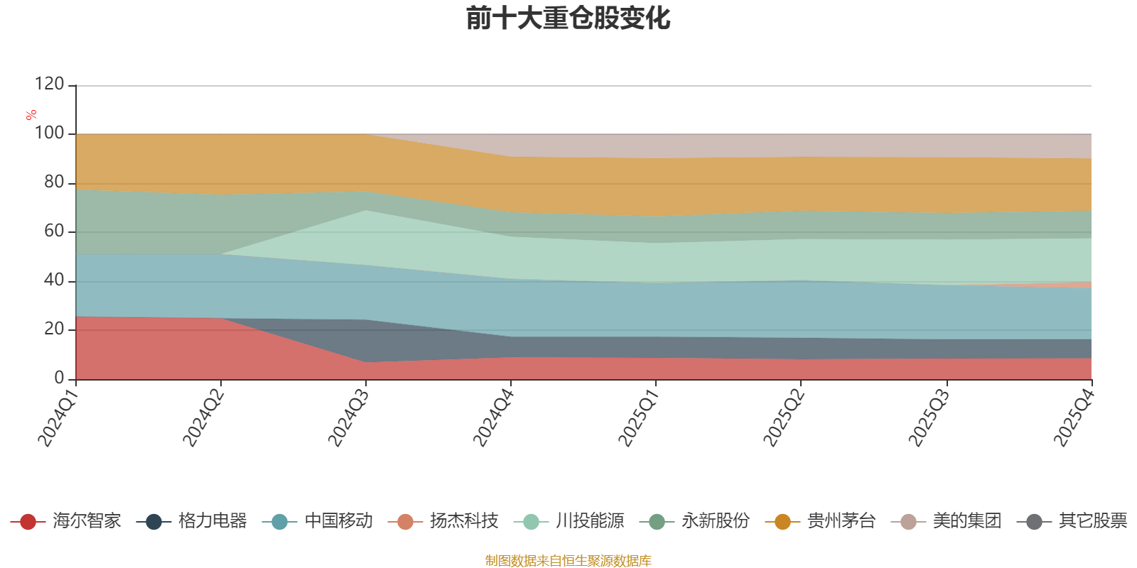 该基金持股集中度较高,近2年前十大重仓股集中度长期超过60%。截至2025年四季度末,基金重仓股分别是贵州茅台、中国移动、川投能源、永新股份、美的集团、海尔智家、格力电器、扬杰科技。