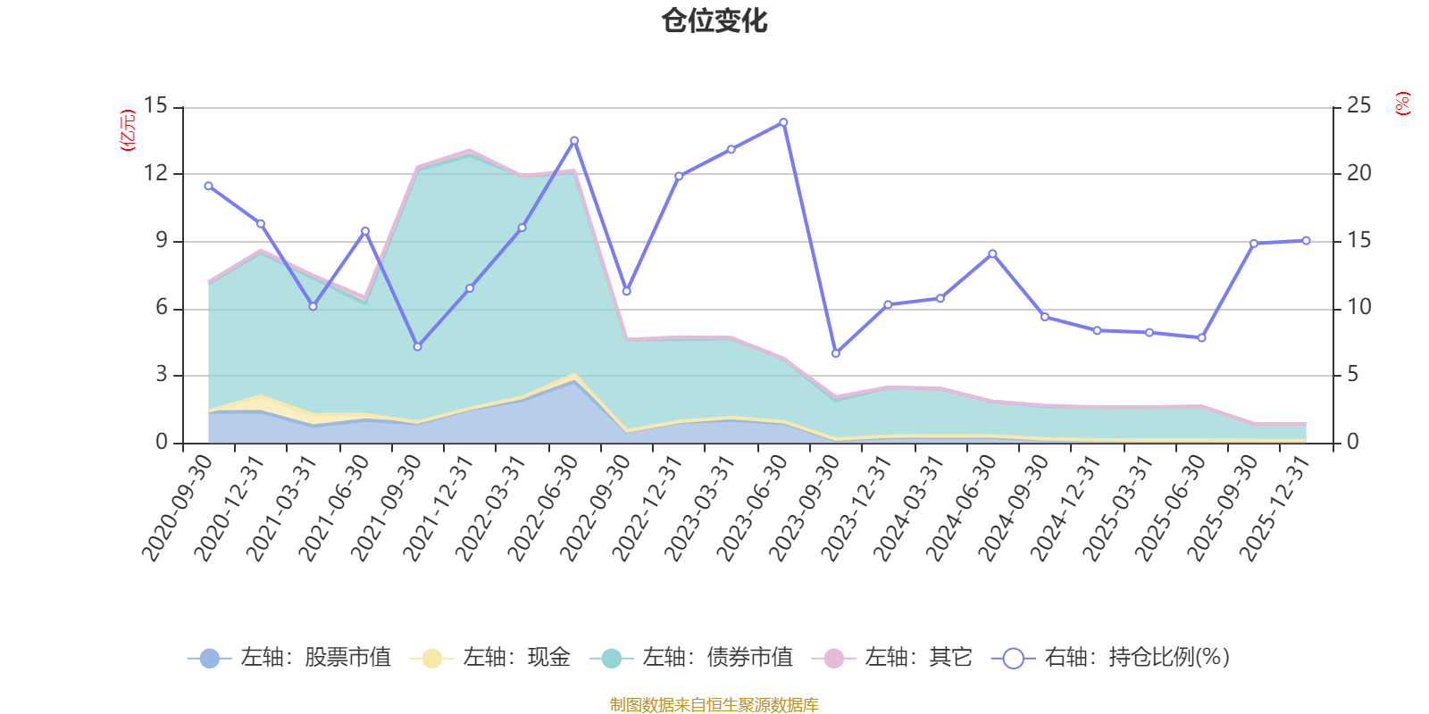 据定期报告数据统计,近三年平均股票仓位为12.61%,同类平均为19.2%。2023年上半年末基金达到23.87%的最高仓位,2023年三季度末最低,为6.68%。