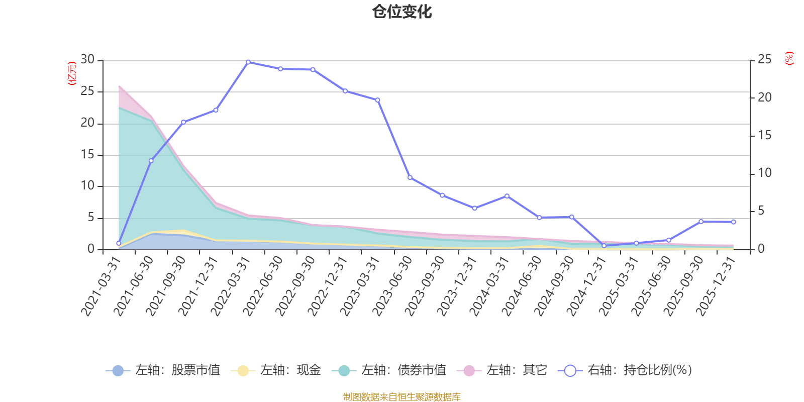 据定期报告数据统计,近三年平均股票仓位为5.62%,同类平均为19.2%。2022年一季度末基金达到24.76%的最高仓位,2024年末最低,为0.5%。