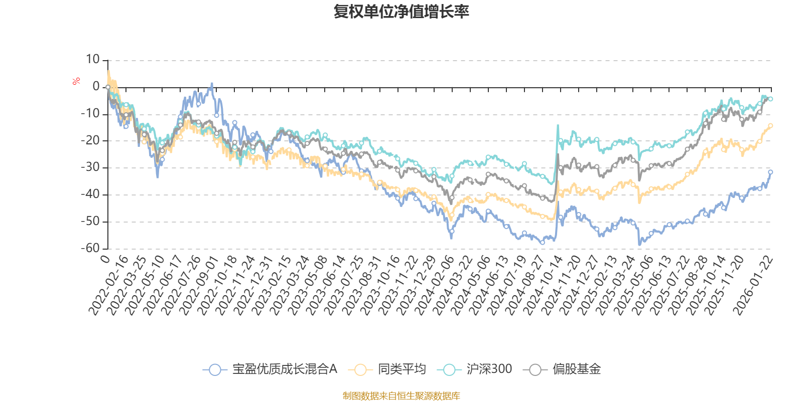 截至1月22日,宝盈优质成长混合A近三个月复权单位净值增长率为21.15%,位于同类可比基金29/621;近半年复权单位净值增长率为36.12%,位于同类可比基金158/621;近一年复权单位净值增长率为46.08%,位于同类可比基金231/613;近三年复权单位净值增长率为-15.84%,位于同类可比基金508/535。