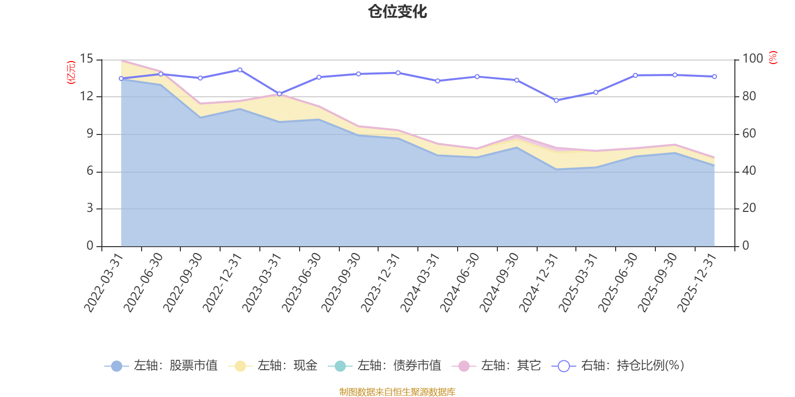 据定期报告数据统计,近三年平均股票仓位为88.38%,同类平均为86.12%。2022年末基金达到94.48%的最高仓位,2024年末最低,为78.15%。