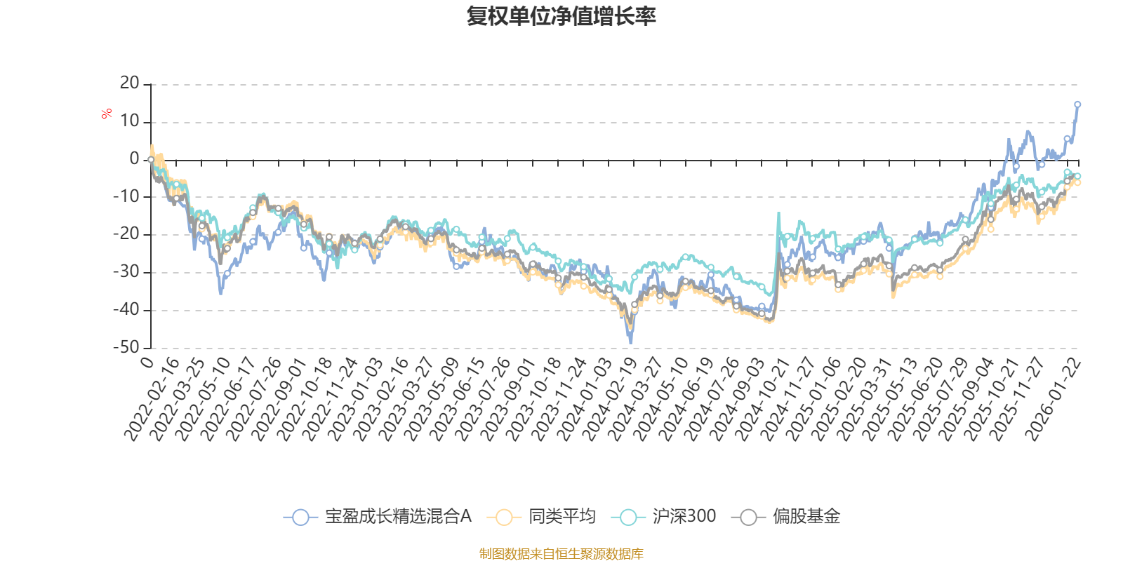 截至1月22日,宝盈成长精选混合A近三个月复权单位净值增长率为15.40%,位于同类可比基金45/265;近半年复权单位净值增长率为33.19%,位于同类可比基金73/265;近一年复权单位净值增长率为48.31%,位于同类可比基金86/265;近三年复权单位净值增长率为42.31%,位于同类可比基金49/256。