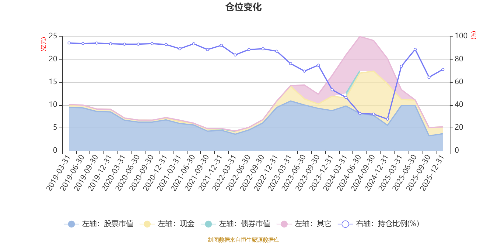 据定期报告数据统计,近三年平均股票仓位为59.3%,同类平均为72.57%。2019年一季度末基金达到94.32%的最高仓位,2024年末最低,为27.73%。