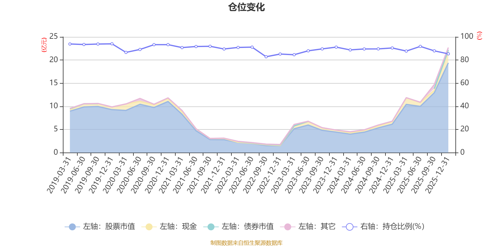 据定期报告数据统计,近三年平均股票仓位为88.72%,同类平均为72.57%。2019年末基金达到94.05%的最高仓位,2022年三季度末最低,为82.85%。
