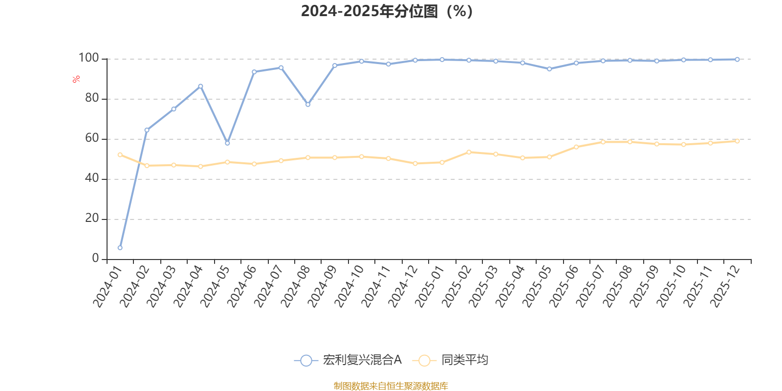 通过所选区间该基金净值增长率分位图,可以观察该基金与同类基金业绩比较情况。图为坐标原点到区间内某时点的净值增长率在同类基金中的分位数。