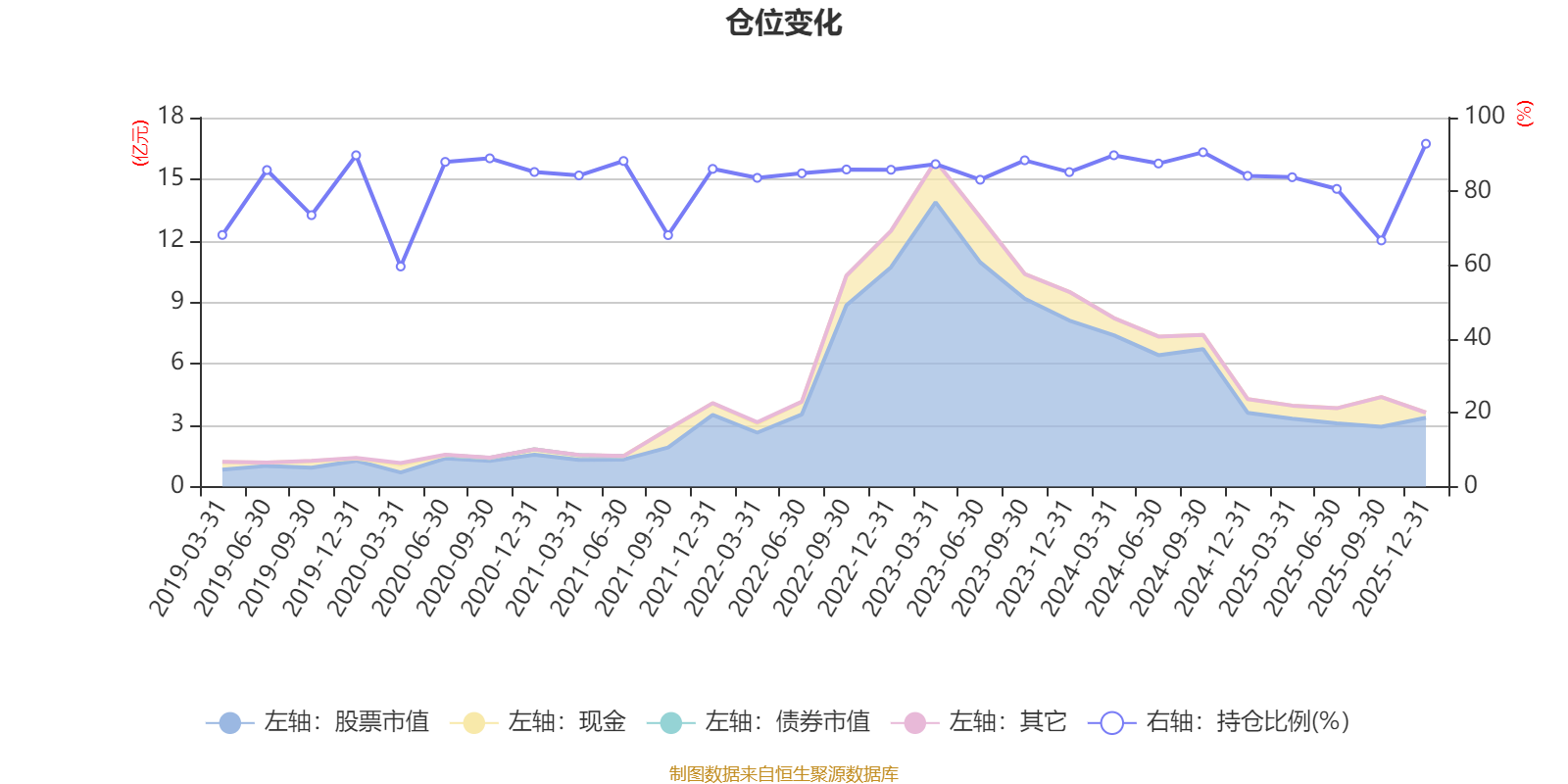 据定期报告数据统计,近三年平均股票仓位为85.04%,同类平均为85.83%。2025年末基金达到92.92%的最高仓位,2020年一季度末最低,为59.65%。