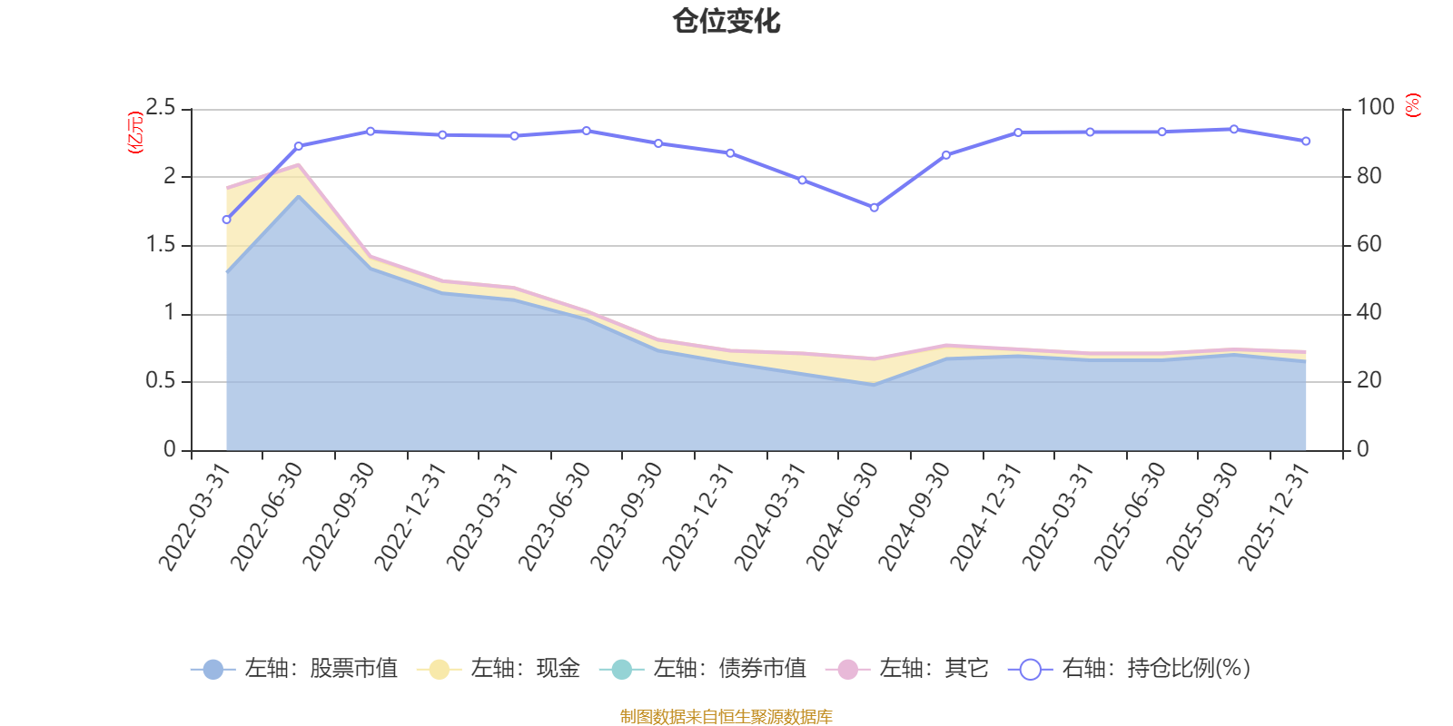 据定期报告数据统计,近三年平均股票仓位为88.65%,同类平均为84.04%。2025年三季度末基金达到94.08%的最高仓位,2022年一季度末最低,为67.61%。