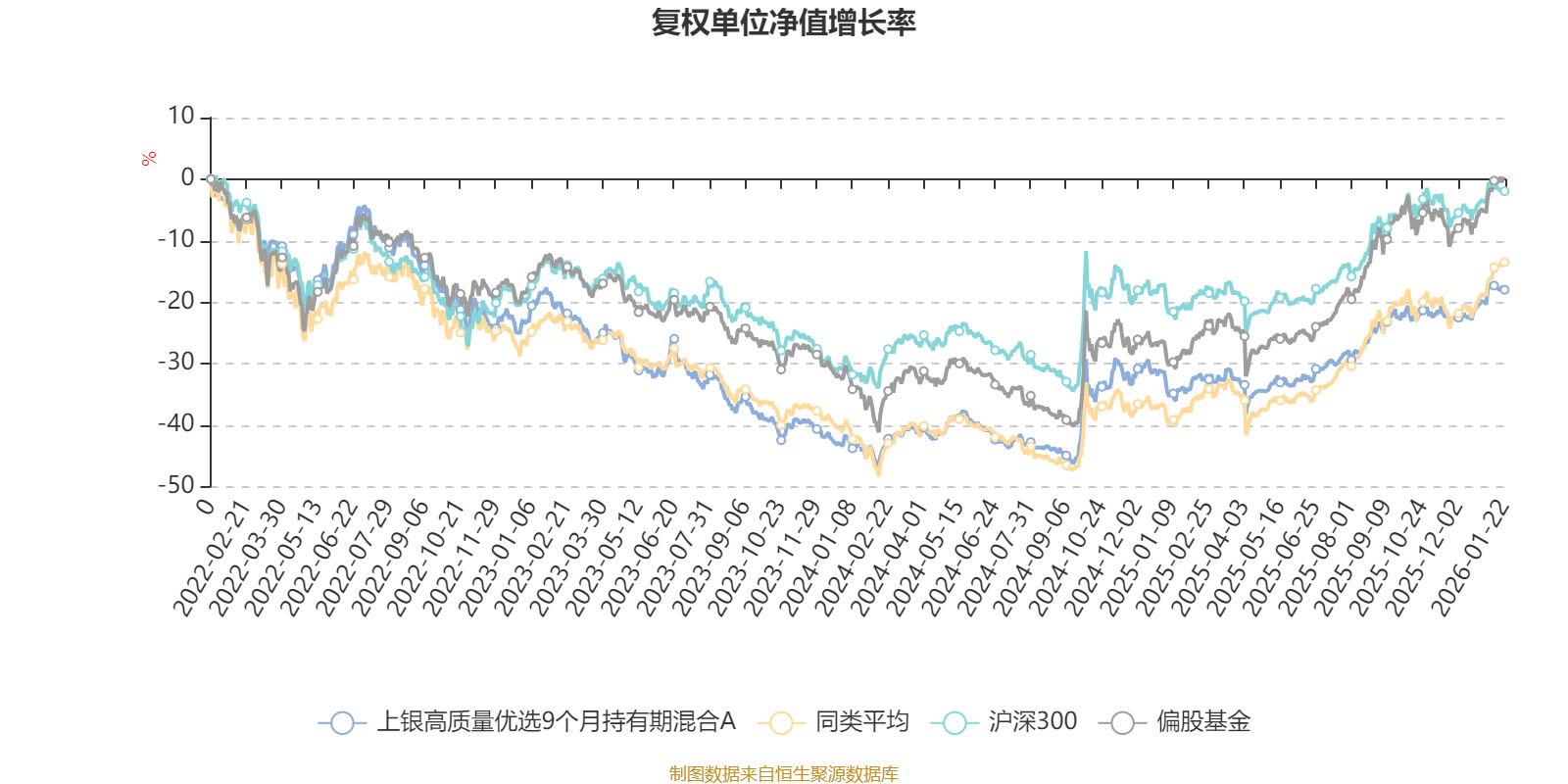 截至1月22日,上银高质量优选9个月持有期混合A近三个月复权单位净值增长率为5.21%,位于同类可比基金475/689;近半年复权单位净值增长率为15.65%,位于同类可比基金482/689;近一年复权单位净值增长率为25.90%,位于同类可比基金491/673;近三年复权单位净值增长率为0.26%,位于同类可比基金290/396。
