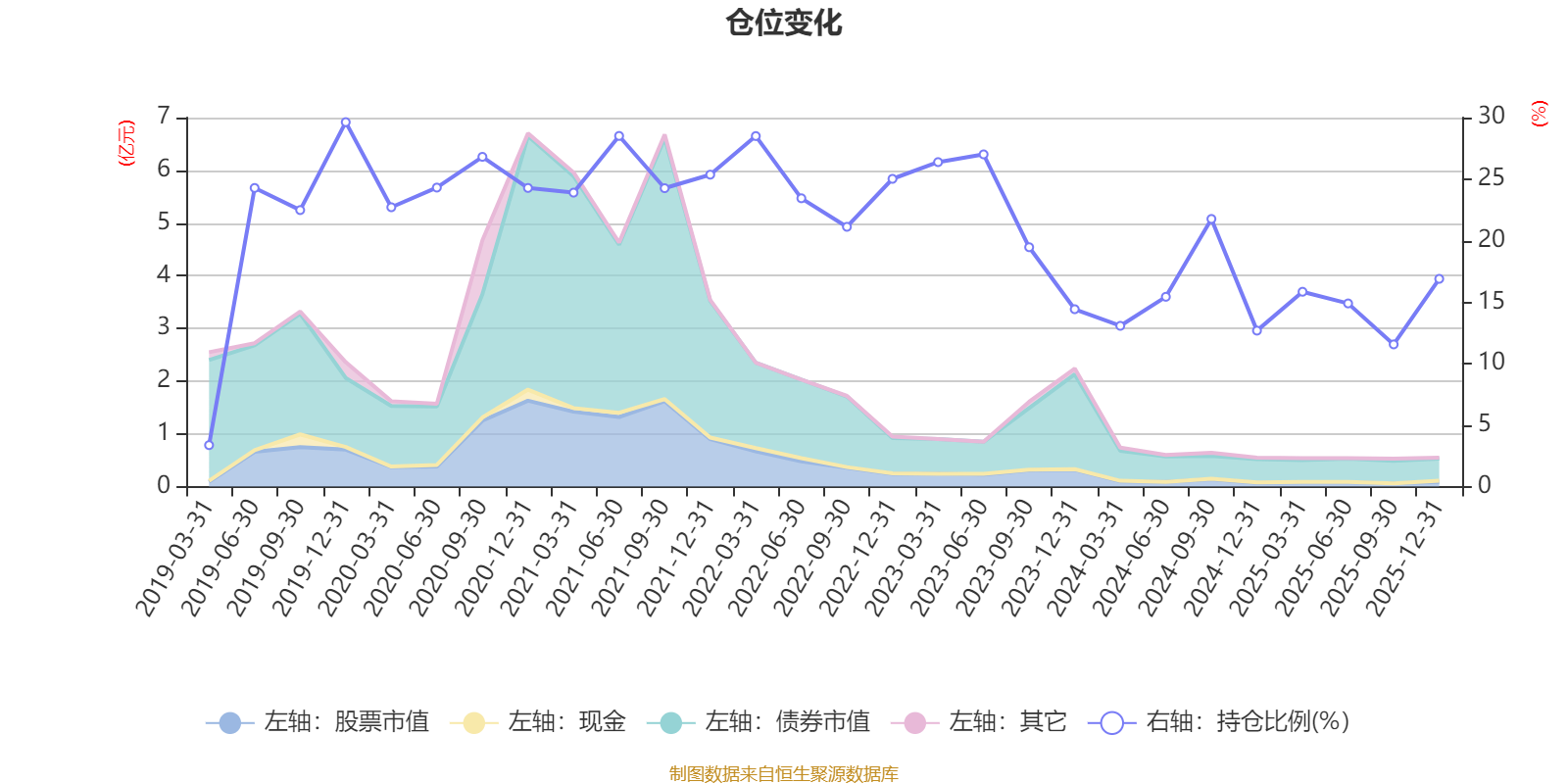据定期报告数据统计,近三年平均股票仓位为17.45%,同类平均为19.2%。2019年末基金达到29.63%的最高仓位,2019年一季度末最低,为3.37%。