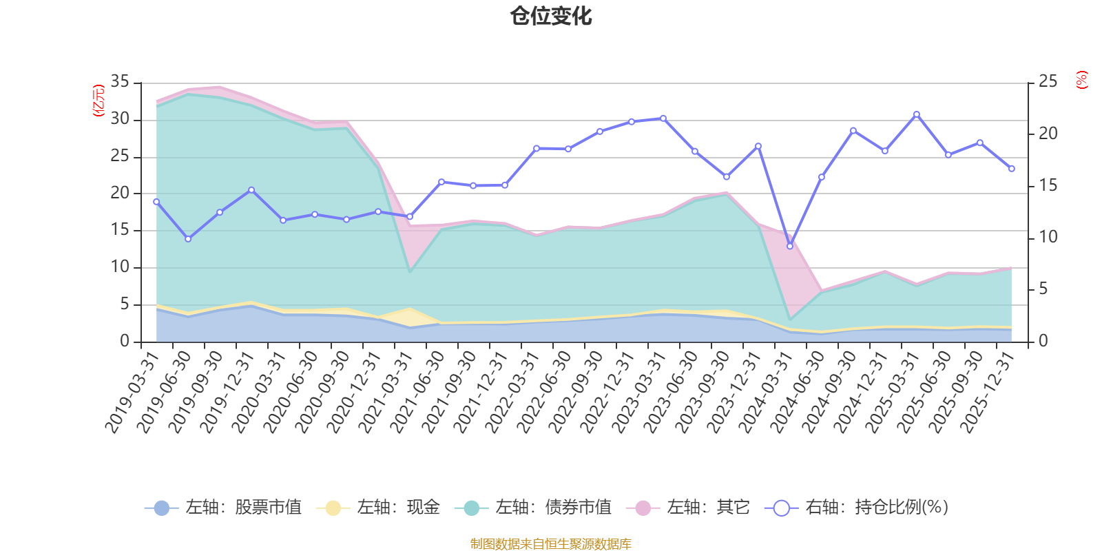 据定期报告数据统计,近三年平均股票仓位为17.88%,同类平均为19.2%。2025年一季度末基金达到21.95%的最高仓位,2024年一季度末最低,为9.23%。
