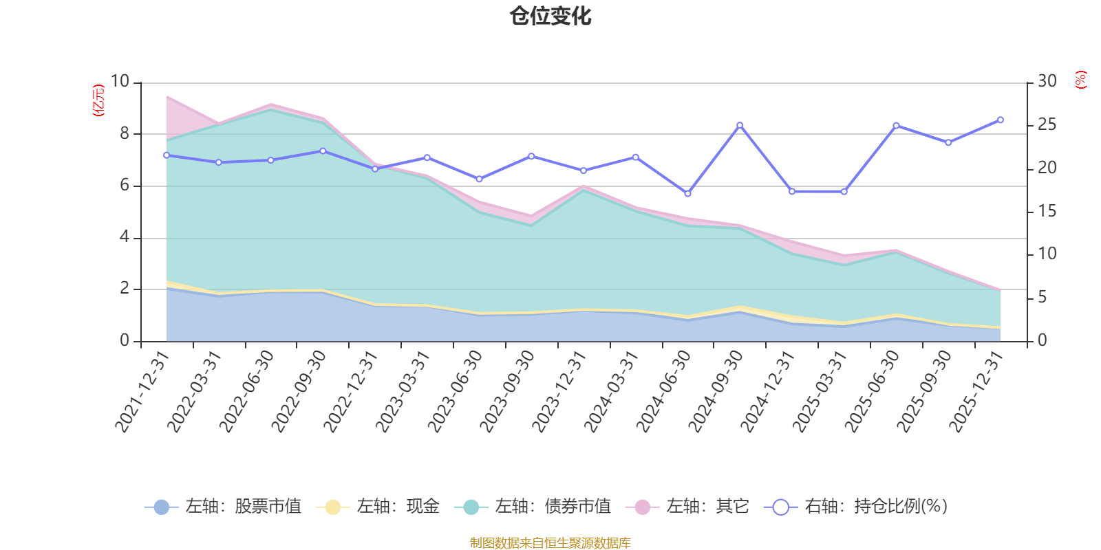 据定期报告数据统计,近三年平均股票仓位为21.11%,同类平均为19.2%。2025年末基金达到25.67%的最高仓位,2024年上半年末最低,为17.13%。