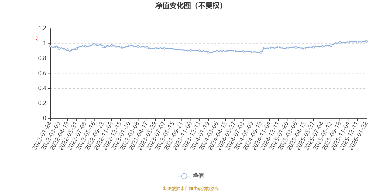 该基金属于偏债混合型基金。截至1月22日,单位净值为1.03元。基金经理是龚霄和姚洋。