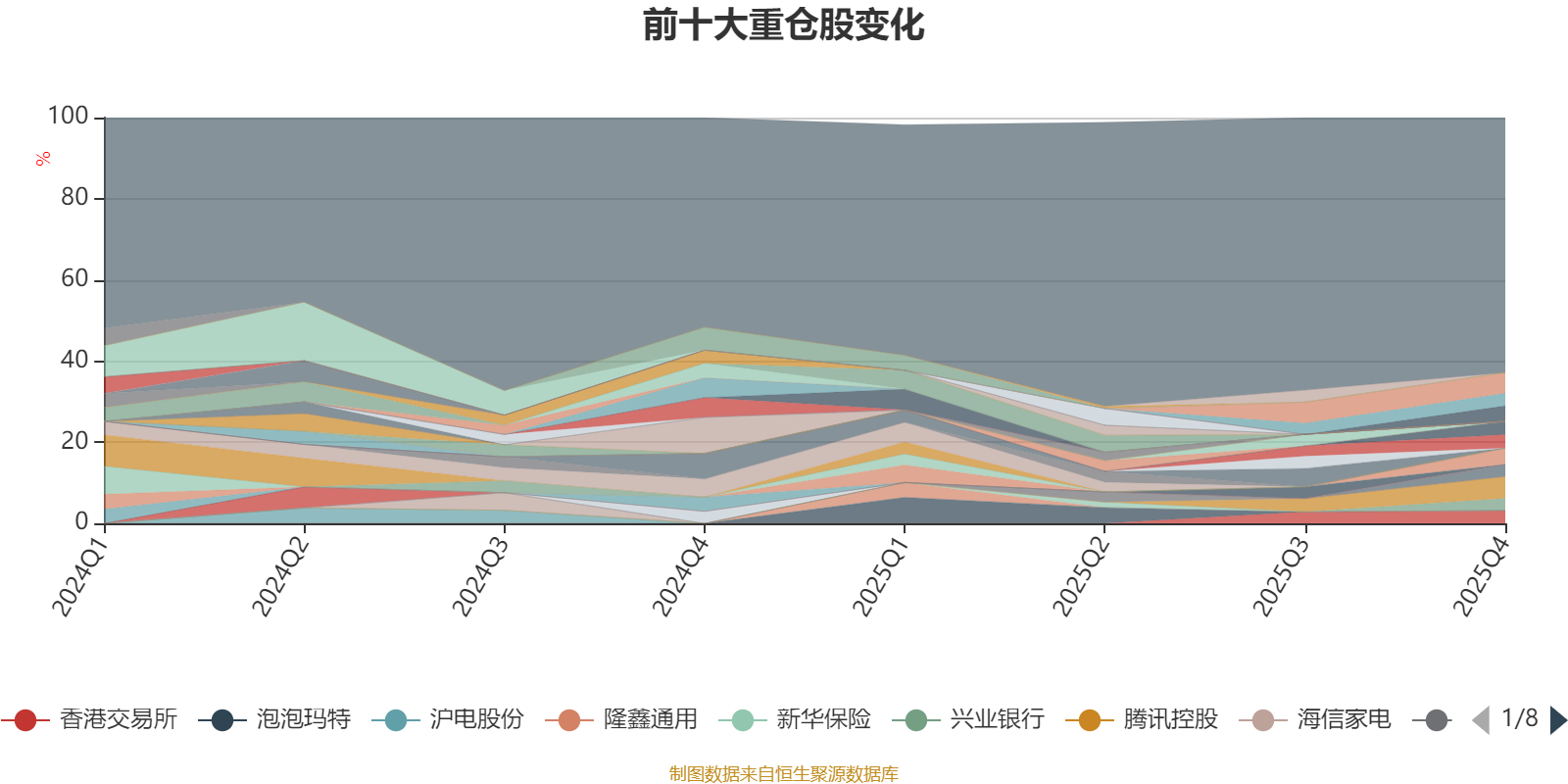 截至2025年四季度末,基金十大重仓股分别是腾讯控股、阿里巴巴-W、贵州茅台、分众传媒、中国神华、招商银行、香港交易所、宁德时代、兴业银行、潍柴动力。