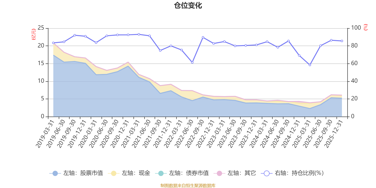 据定期报告数据统计,近三年平均股票仓位为79.6%,同类平均为72.57%。2021年一季度末基金达到93.05%的最高仓位,2025年一季度末最低,为58.44%。