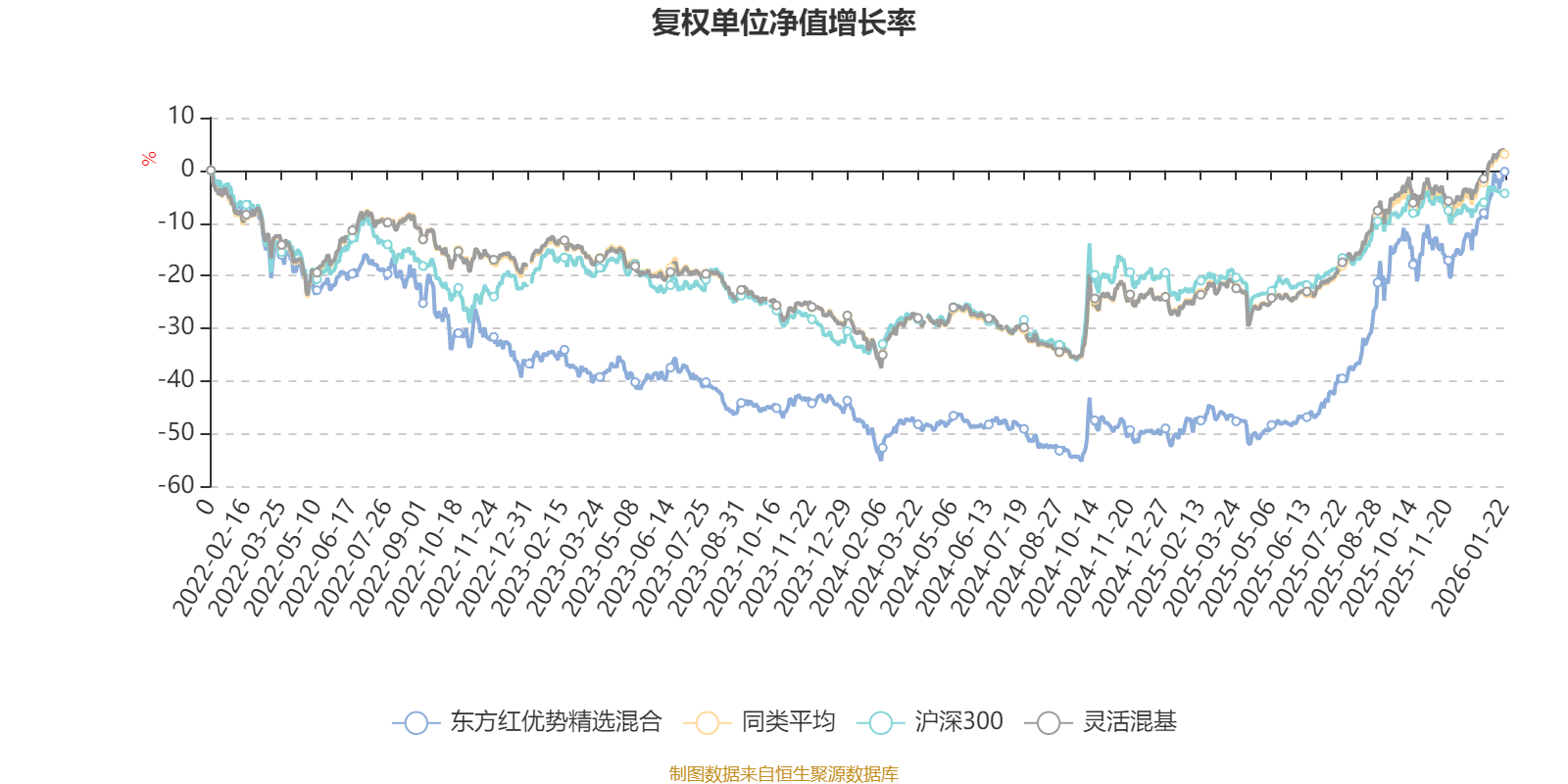 截至1月22日,东方红优势精选混合近三个月复权单位净值增长率为18.25%,位于同类可比基金159/1286;近半年复权单位净值增长率为64.81%,位于同类可比基金57/1286;近一年复权单位净值增长率为87.89%,位于同类可比基金40/1286;近三年复权单位净值增长率为53.50%,位于同类可比基金164/1286。