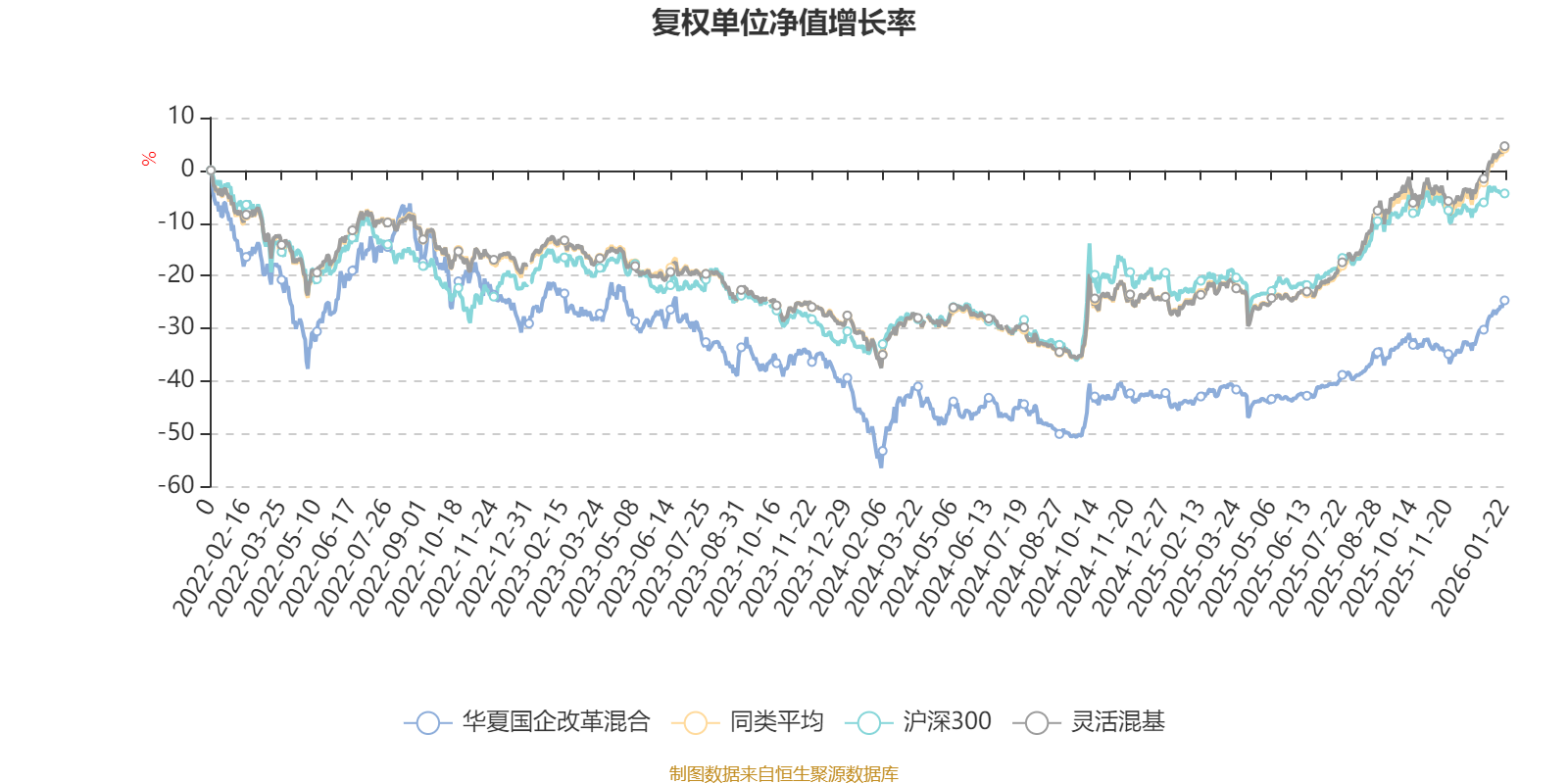 截至1月22日,华夏国企改革混合近三个月复权单位净值增长率为12.69%,位于同类可比基金409/1286;近半年复权单位净值增长率为23.09%,位于同类可比基金592/1286;近一年复权单位净值增长率为34.48%,位于同类可比基金606/1286;近三年复权单位净值增长率为-3.15%,位于同类可比基金1059/1286。