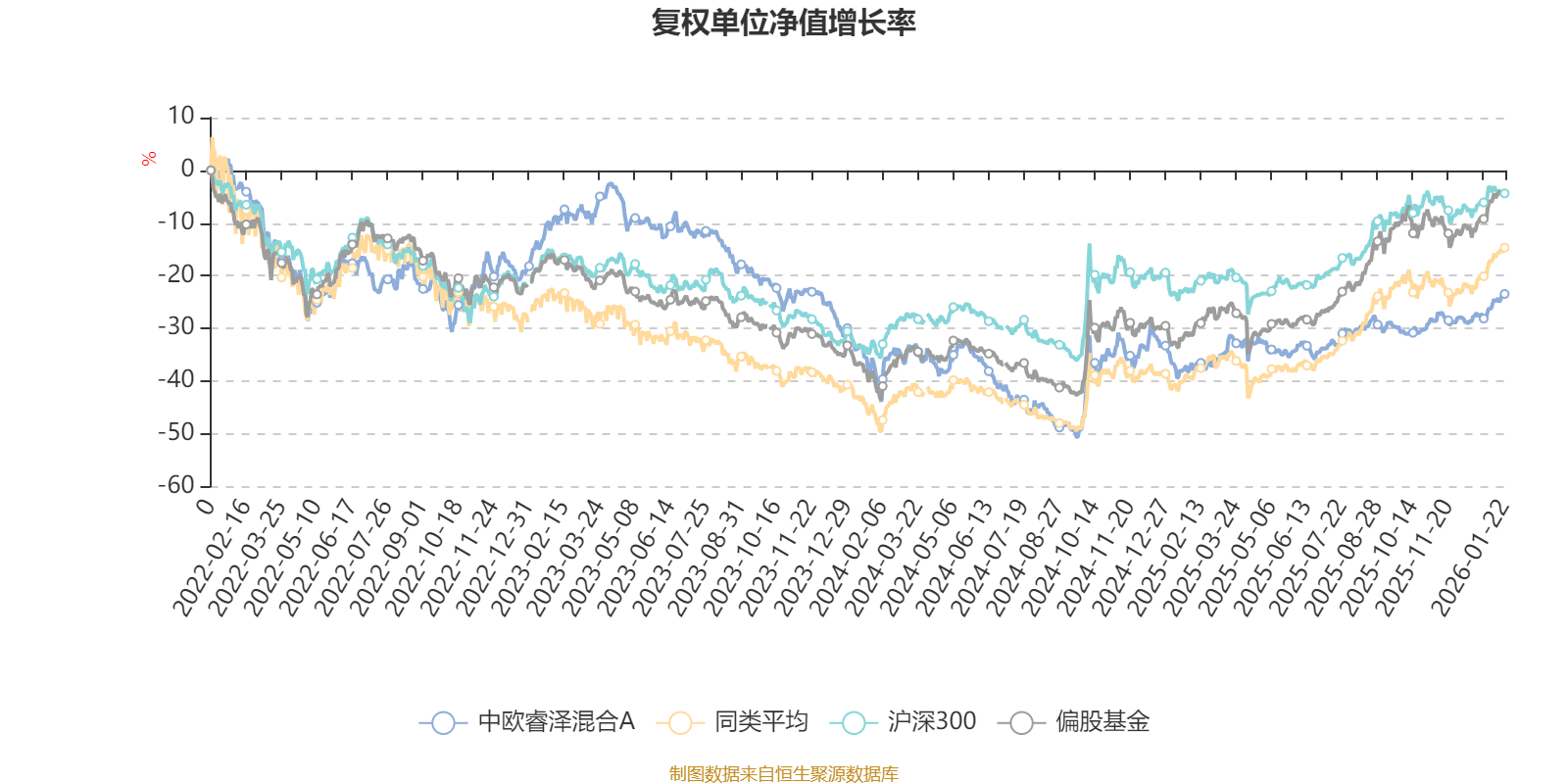 截至1月22日,中欧睿泽混合A近三个月复权单位净值增长率为10.14%,位于同类可比基金275/621;近半年复权单位净值增长率为10.89%,位于同类可比基金507/621;近一年复权单位净值增长率为23.95%,位于同类可比基金492/613;近三年复权单位净值增长率为-14.90%,位于同类可比基金502/535。