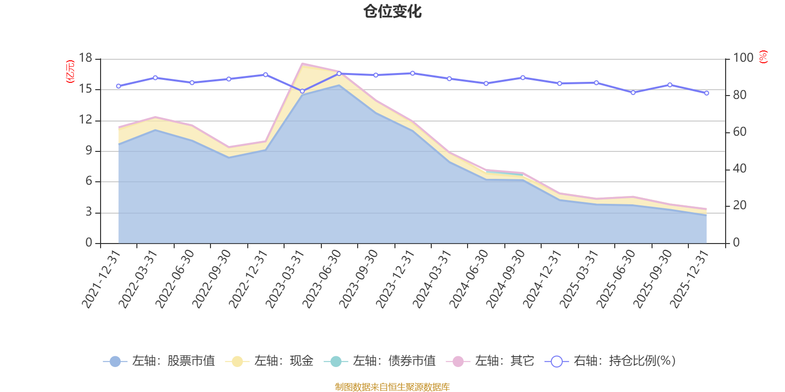 据定期报告数据统计,近三年平均股票仓位为87.18%,同类平均为85.83%。2023年末基金达到92.17%的最高仓位,2025年末最低,为81.42%。