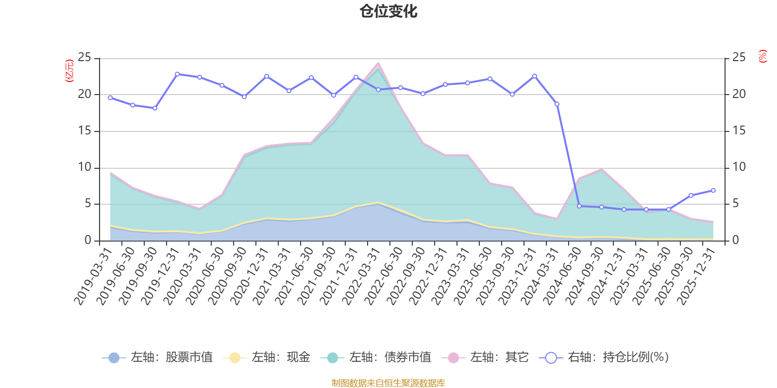 据定期报告数据统计,近三年平均股票仓位为11.71%,同类平均为19.2%。2019年末基金达到22.82%的最高仓位,2024年末最低,为4.28%。