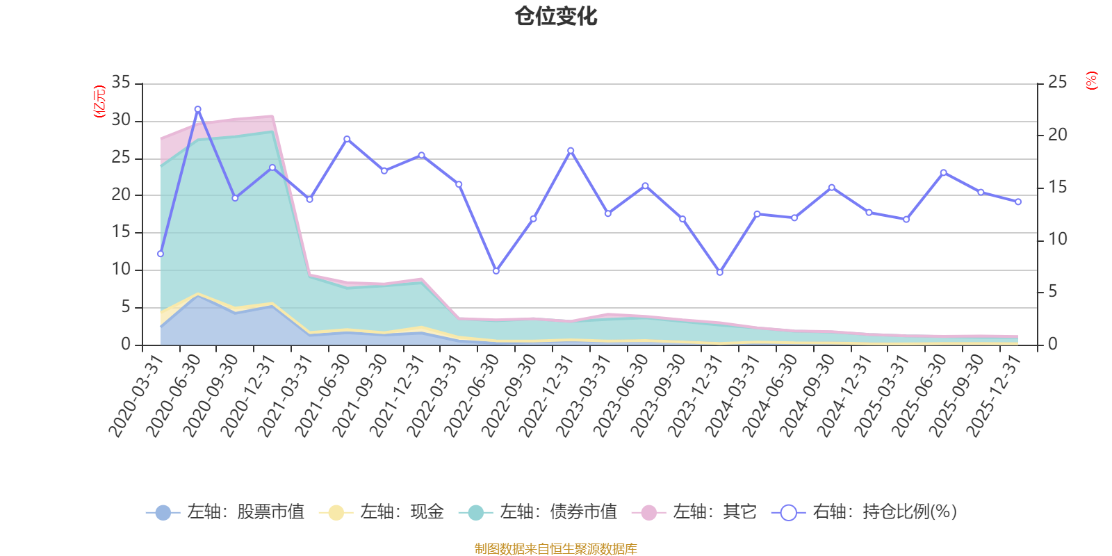 基金管理人在四季报中表示,2025 年四季度,行业方面,石油石化、国防军工、有色金属涨幅居前,房地产、医药、计算机表现落后。债券市场方面,虽然宏观经济走弱利多债市,但市场担心赎回费新规落地后的债基赎回压力以及年初超长债发行压力,同时央行宽松力度持续低于市场预期,债市整体表现偏弱。1年期国债下行3BP至1.34%,10 年期国债下行1BP至1.85%,30年国债上行2BP至2.27%。组合在四季度适当降低了权益仓位以应对四季度权益市场波动,结构上均衡配置在电力设备、化工、有色、高股息等方向。债券仓位方面,维持中性偏积极的久期水平。