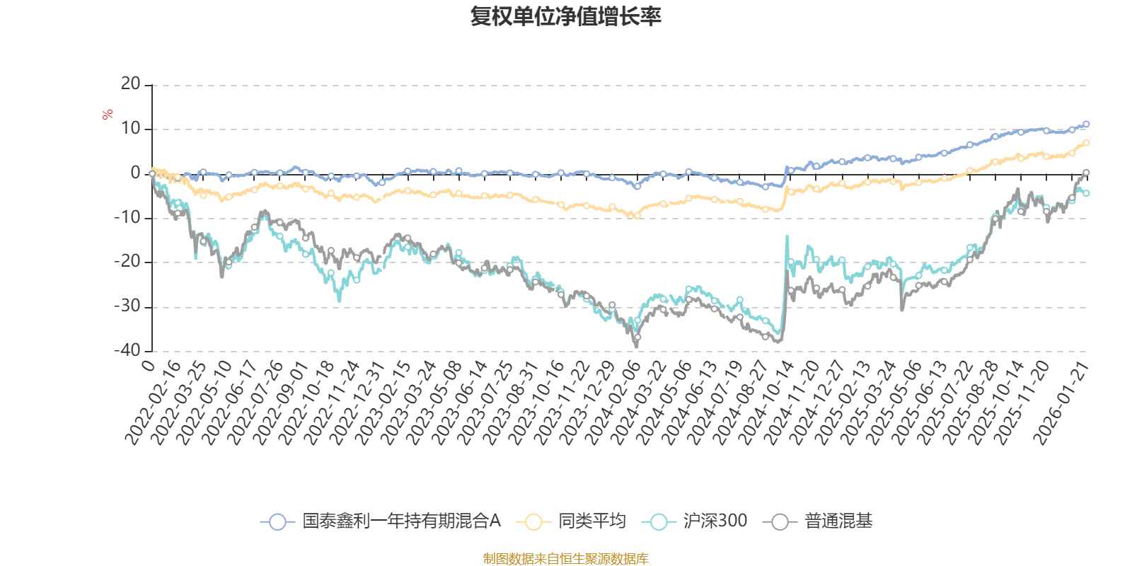 截至1月21日,国泰鑫利一年持有期混合A近三个月复权单位净值增长率为1.51%,位于同类可比基金395/629;近半年复权单位净值增长率为4.50%,位于同类可比基金295/629;近一年复权单位净值增长率为7.43%,位于同类可比基金319/626;近三年复权单位净值增长率为11.53%,位于同类可比基金288/564。